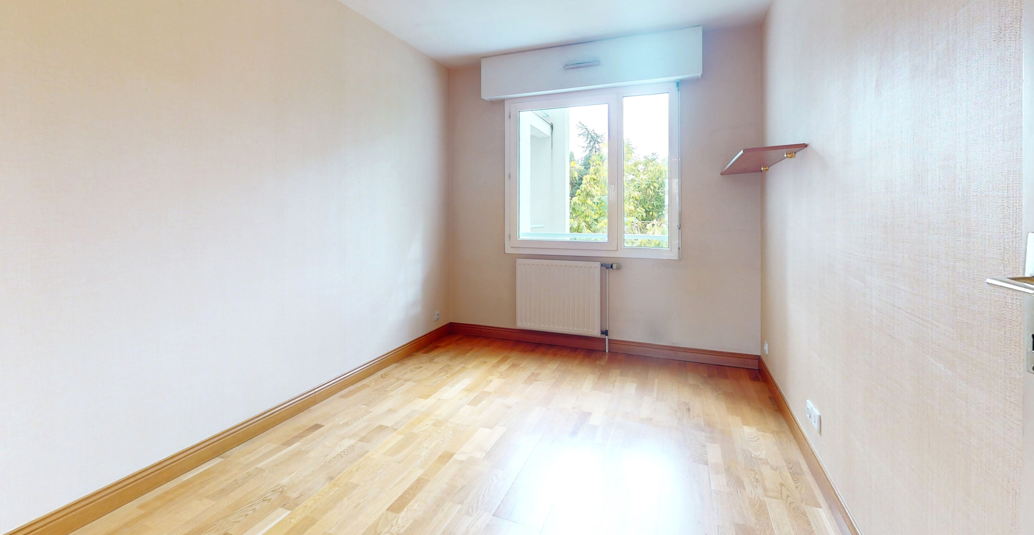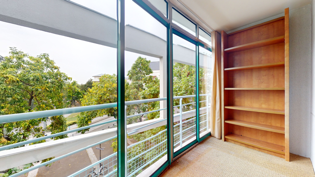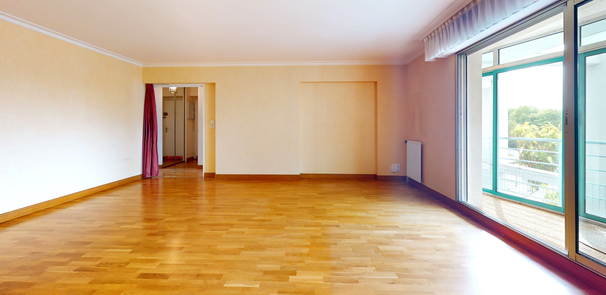 Vaste séjour lumineux exposé au Sud, donnant sur un balcon de type loggia (8m2) avec vue dégagée.
