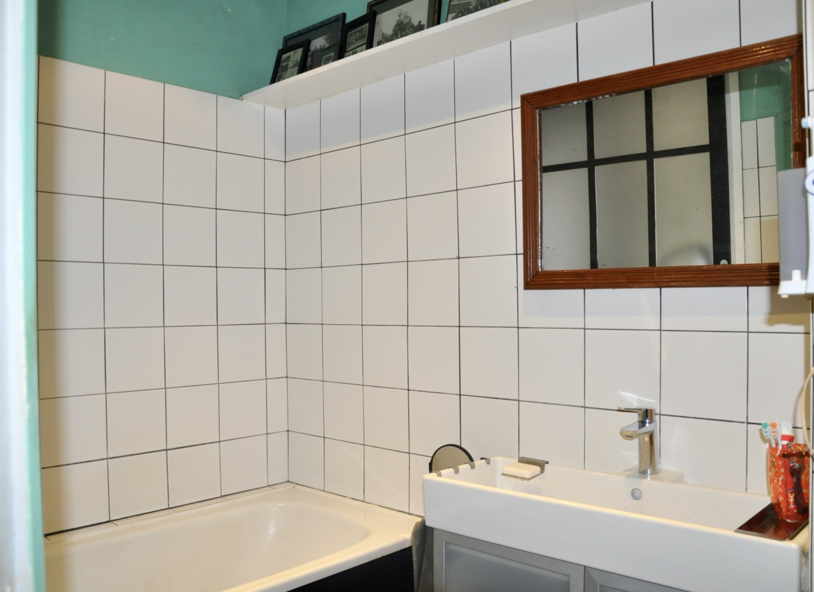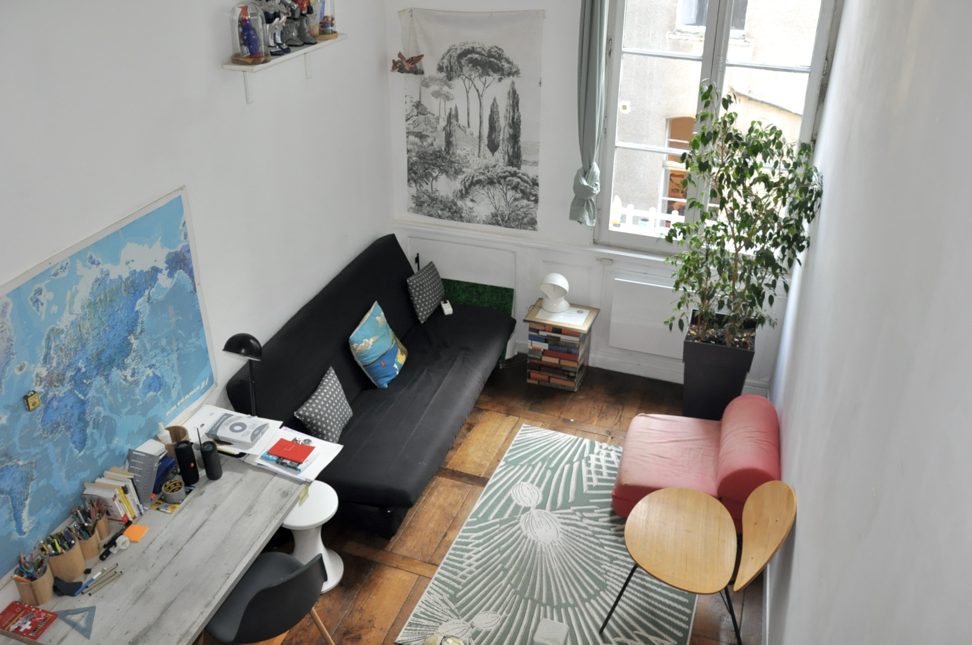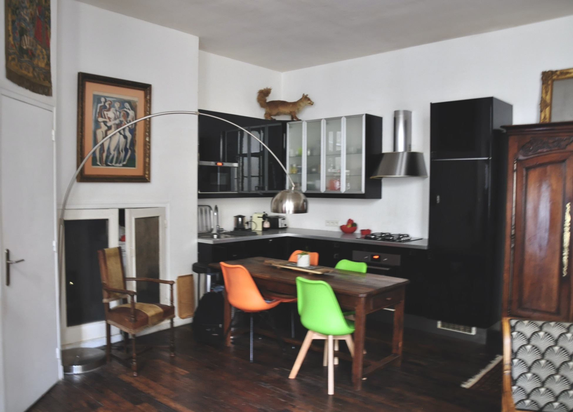 Vaste séjour sur parquet, avec cuisine américaine, Belle hauteur sous plafond. Exposée Sud et donnant sur cour.