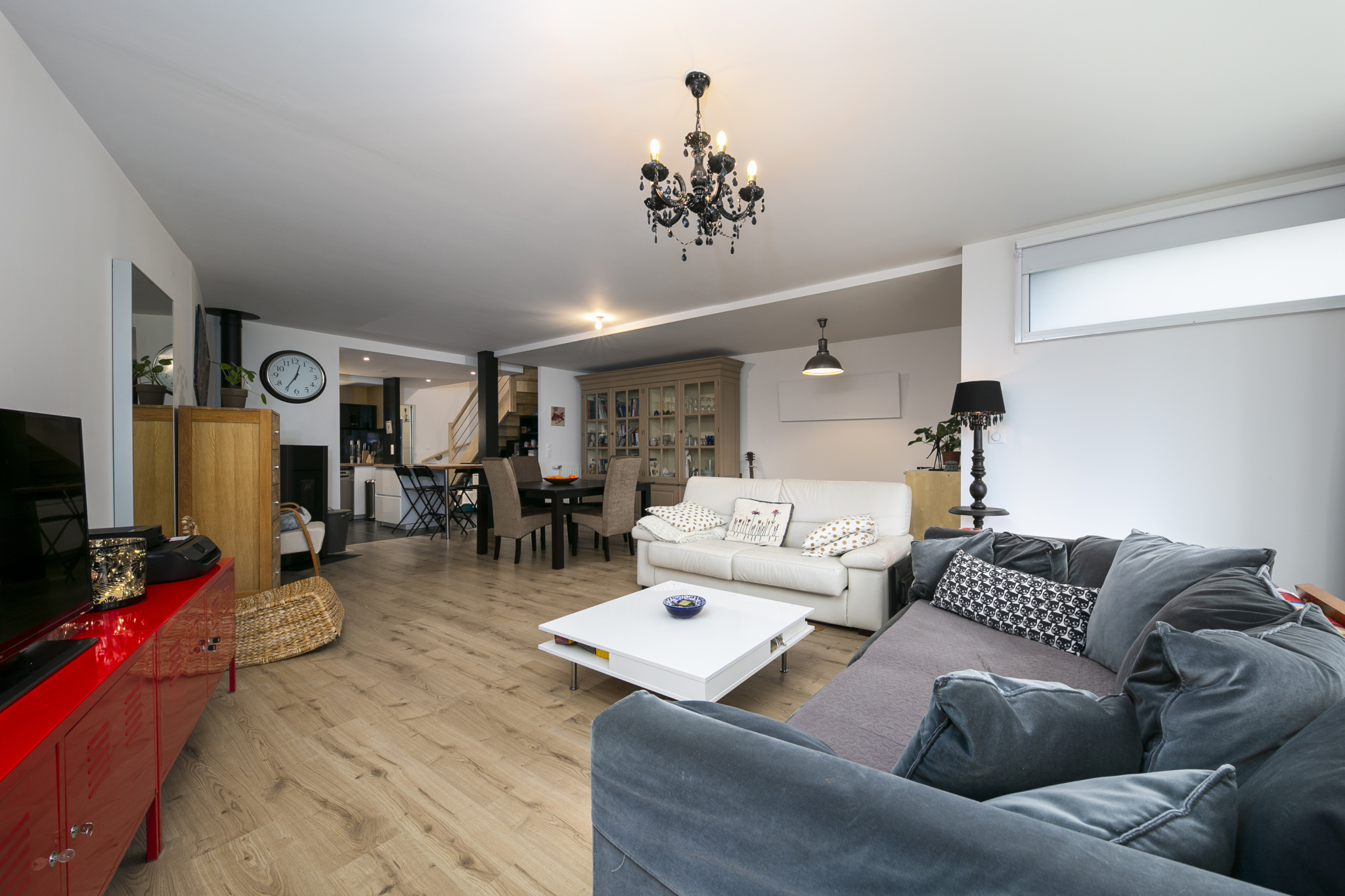 Au RDC, une entrée avec placard, un wc buanderie, une cuisine équipée et aménagée, un séjour-salon de plus de 40 m2 avec poele pellets.