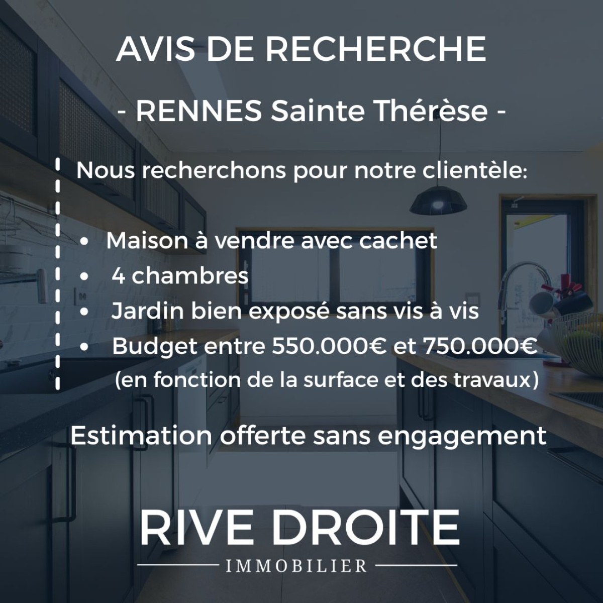 RIVE DROITE Agence de RENNES - Nous recherchons activement des maisons à vendre à RENNES Sainte Thérèse pour le compte de notre clientèle en recherche active sur ce secteur. Critères de recherche: Situation géographique proche de la gare, des transports et écoles - Environnement calme - Maison 3 ou 4 chambres - Travaux de raffraichissement acceptés - Budget entre 550.000€ et 750.000€ selon surface, emplacement, et travaux à réaliser. Vous avez un projet de vente ? ESTIMATION OFFERTE SANS ENGAGEMENT -Â