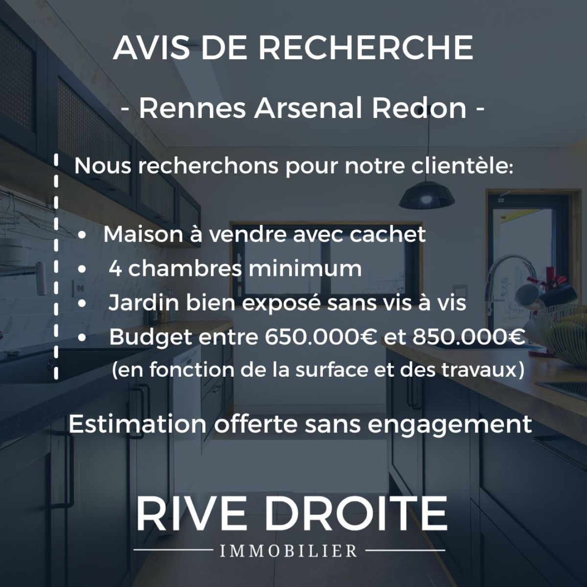 RIVE DROITE Agence de RENNES - Nous recherchons activement des maisons à vendre à RENNES Arsenal Redon pour le compte de notre clientèle en recherche active sur ce secteur. Critères de recherche: Situation géographique proche du métro, des transports et écoles - Environnement calme - Maison 3 ou 4 chambres - Travaux de raffraichissement acceptés - Budget entre 650.000€ et 850.000€ selon surface, emplacement, et travaux à réaliser. Vous avez un projet de vente ? ESTIMATION OFFERTE SANS ENGAGEMENT -Â