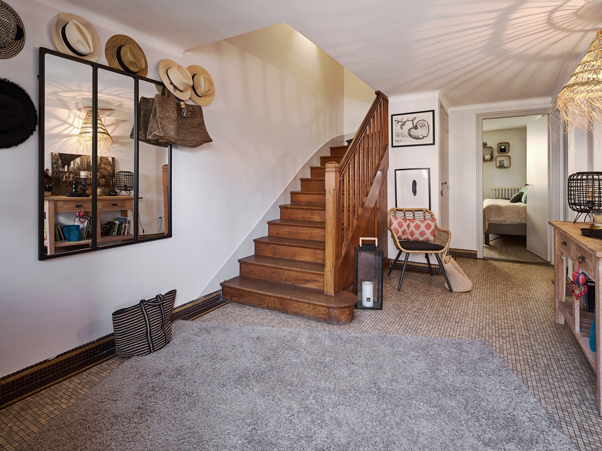 Cette jolie maison de charme des années 50, rénovée entièrement en 2017 se compose au rez de chaussée, d'une vaste entrée, d'une chambre ou bureau, d'un placard, d'un cellier et d'un garage.