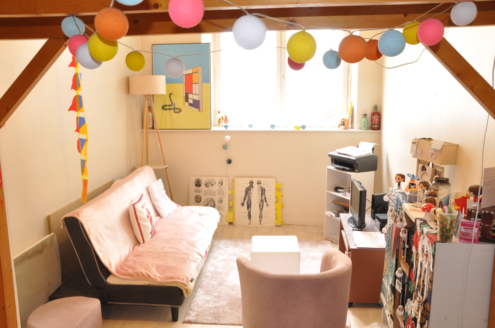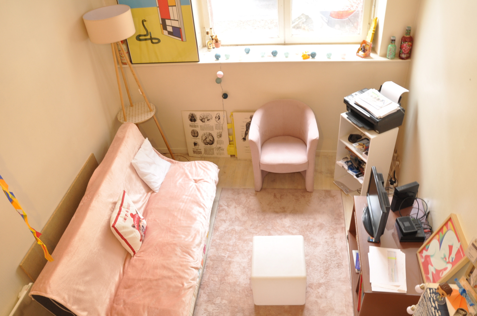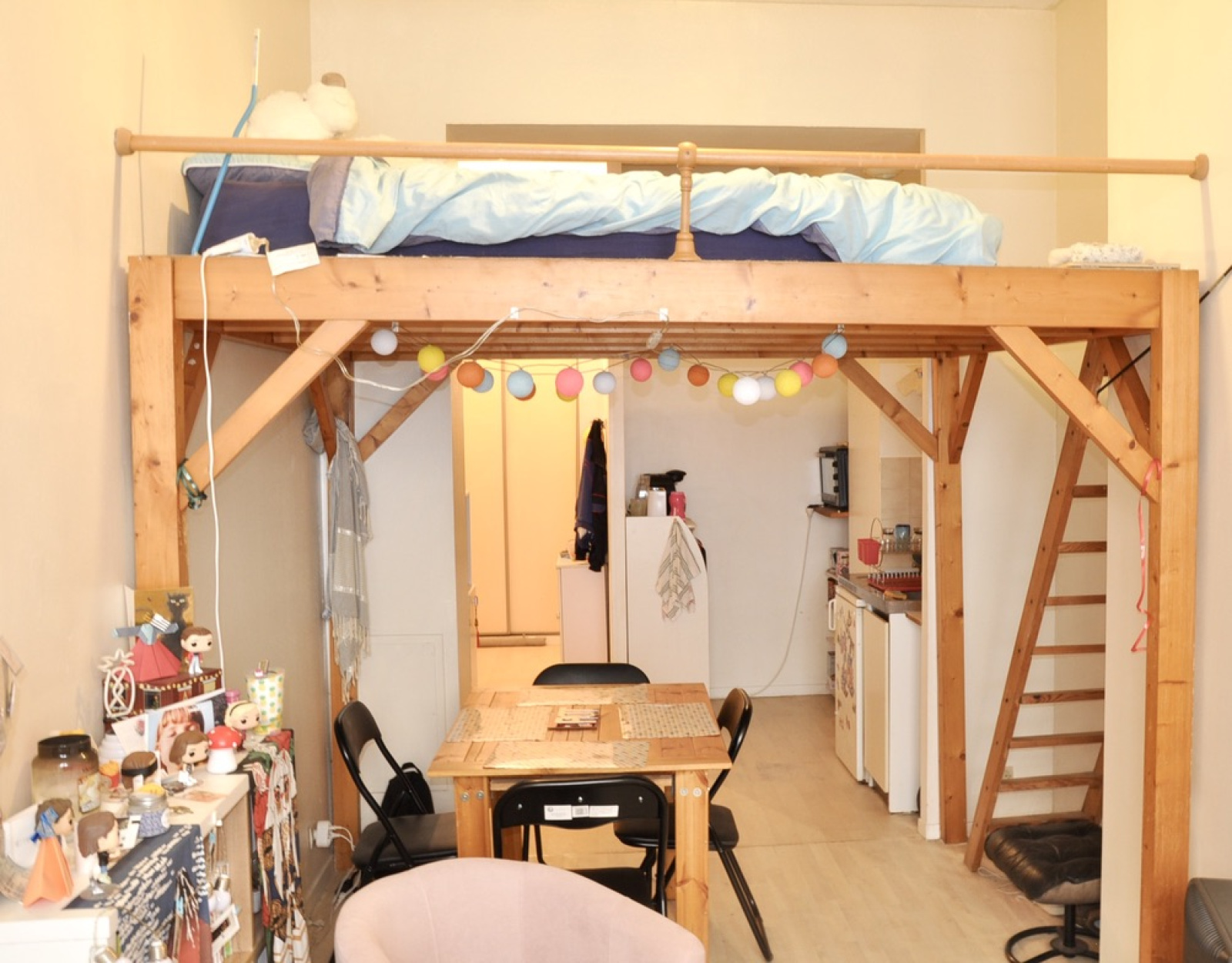 Large fenêtre donnant sur la rue, en rez-de-chaussée. Importante hauteur sous plafond qui permet l'installation d'un lit en mezzanine.