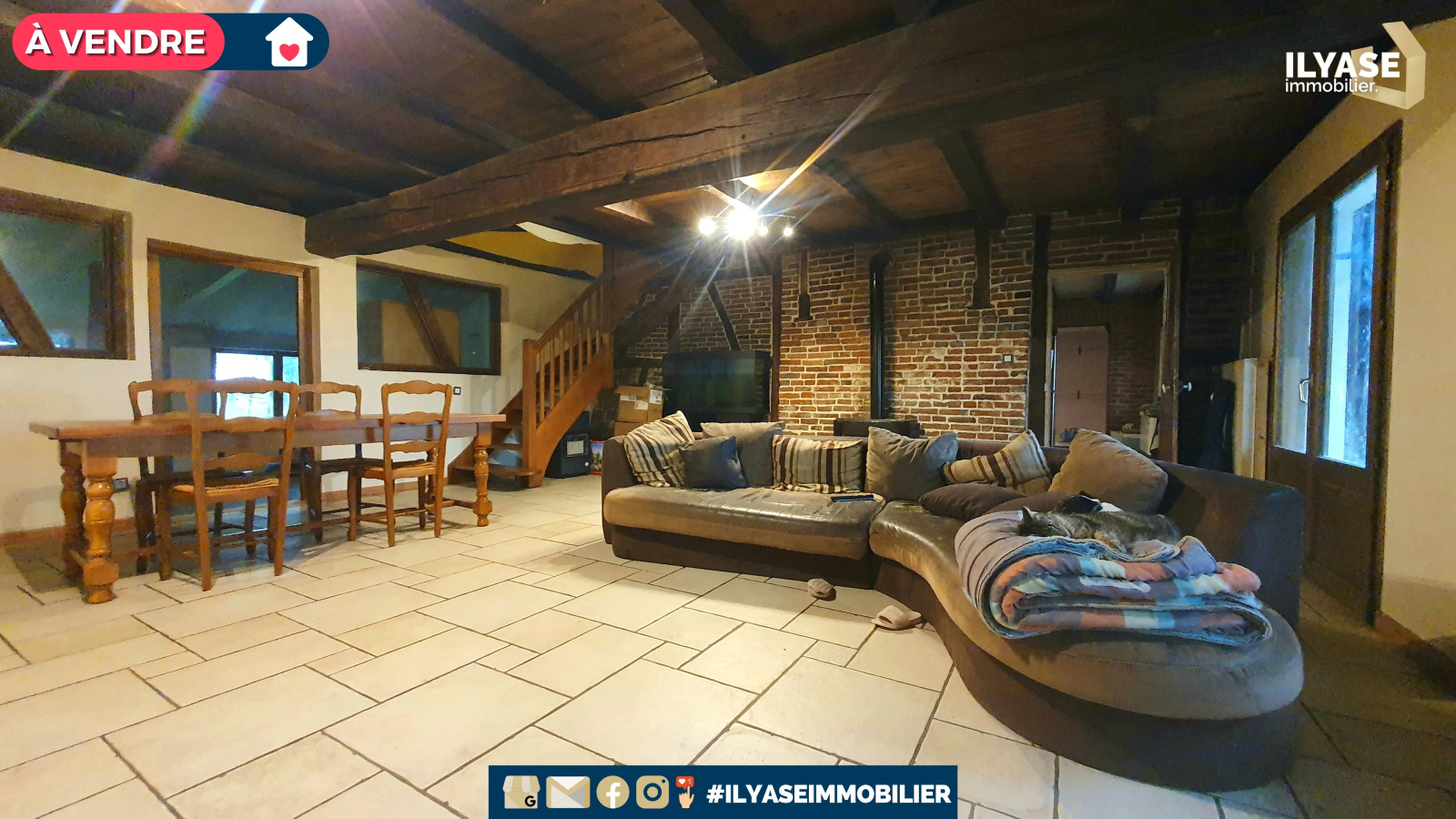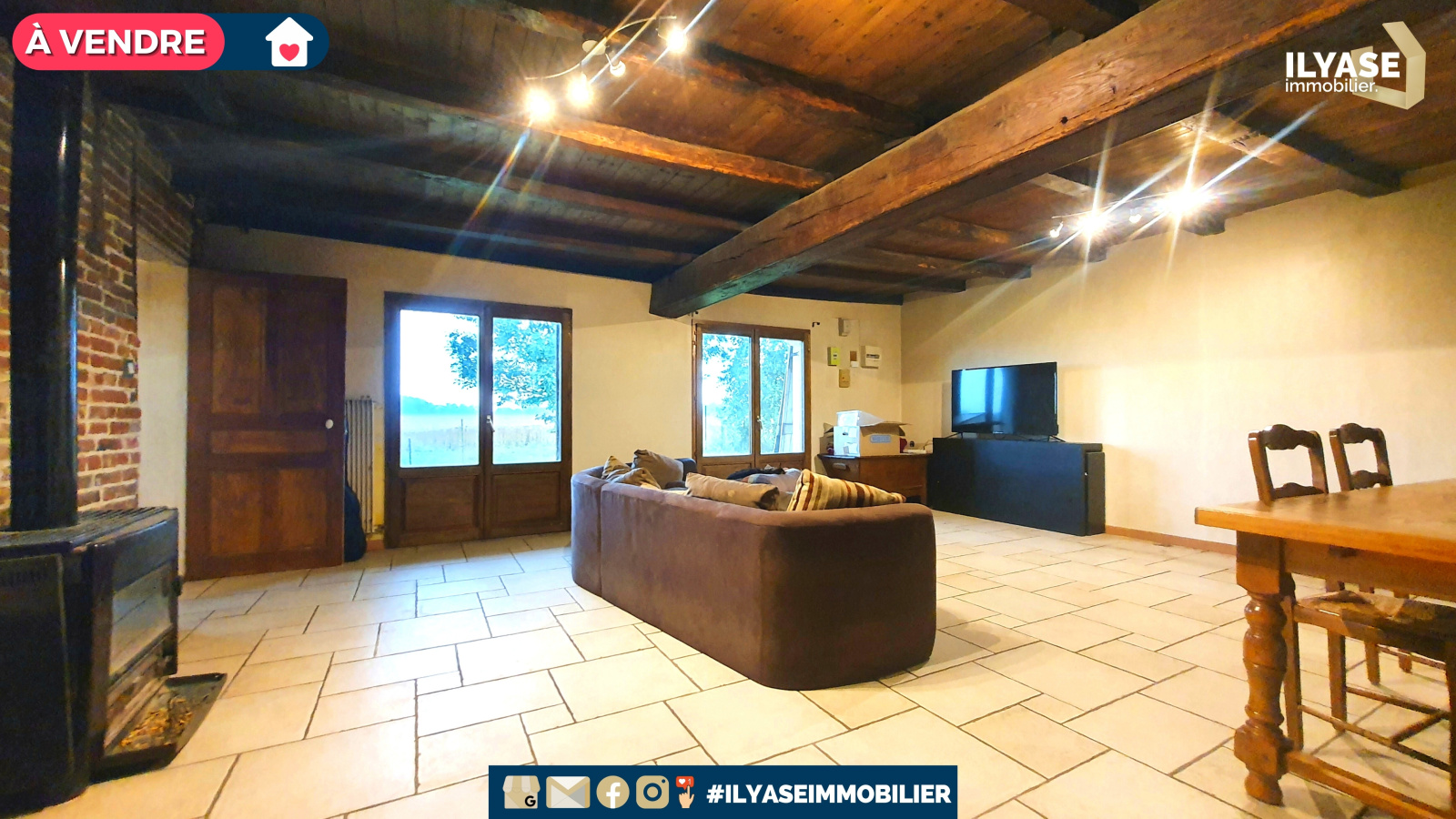 - Un grand salon avec un poêle à bois, des murs en briques et des poutres apparentes apportant le charme de l'ancien