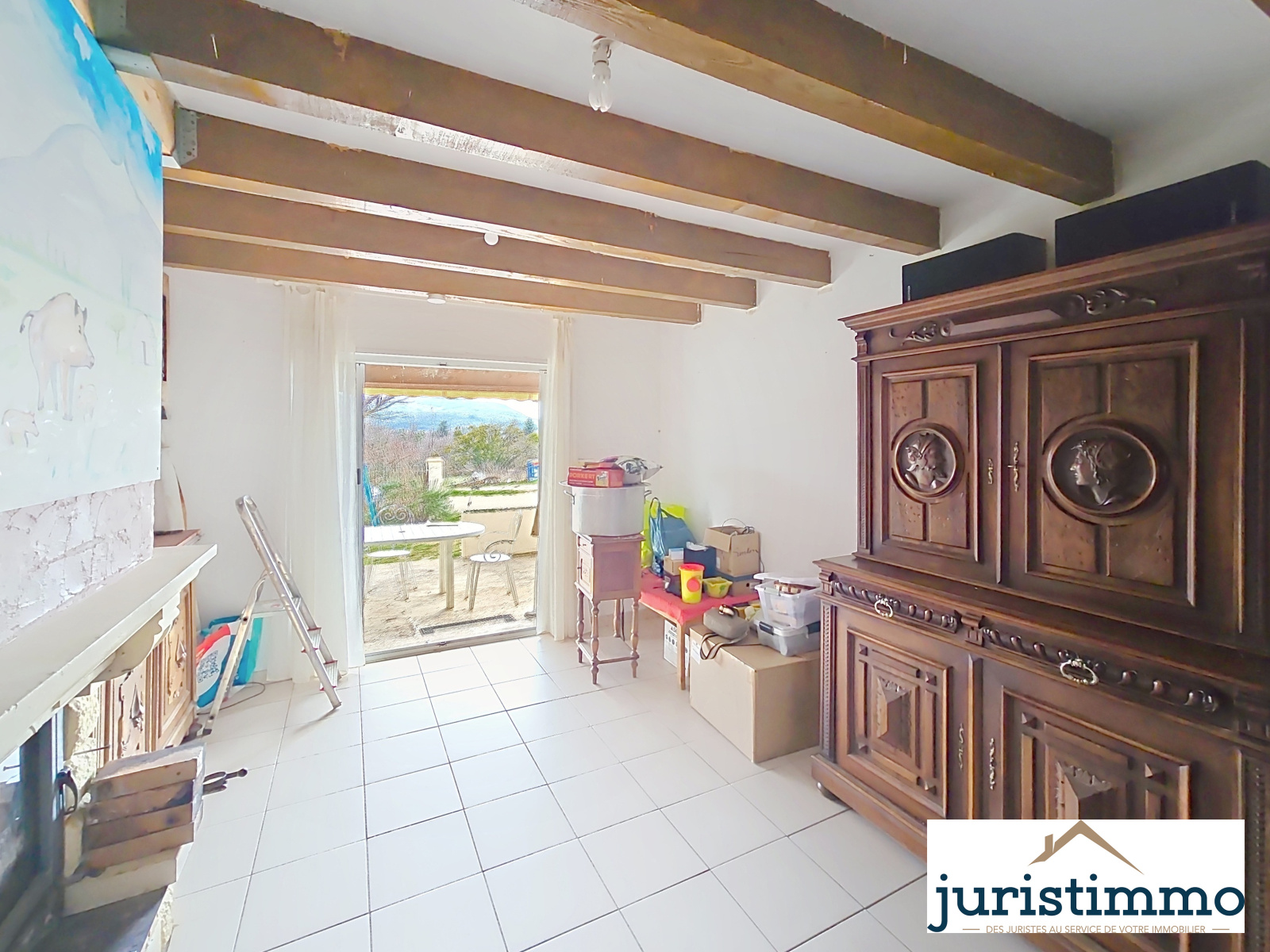 La pièce de vie est accessible depuis une baie vitrée qui donne sur la terrasse et également depuis le garage.