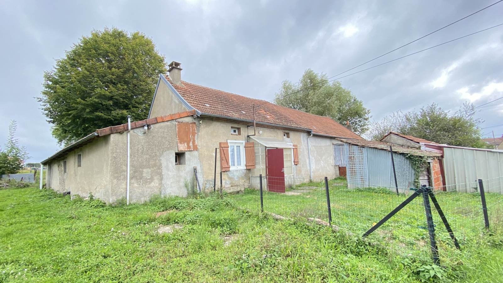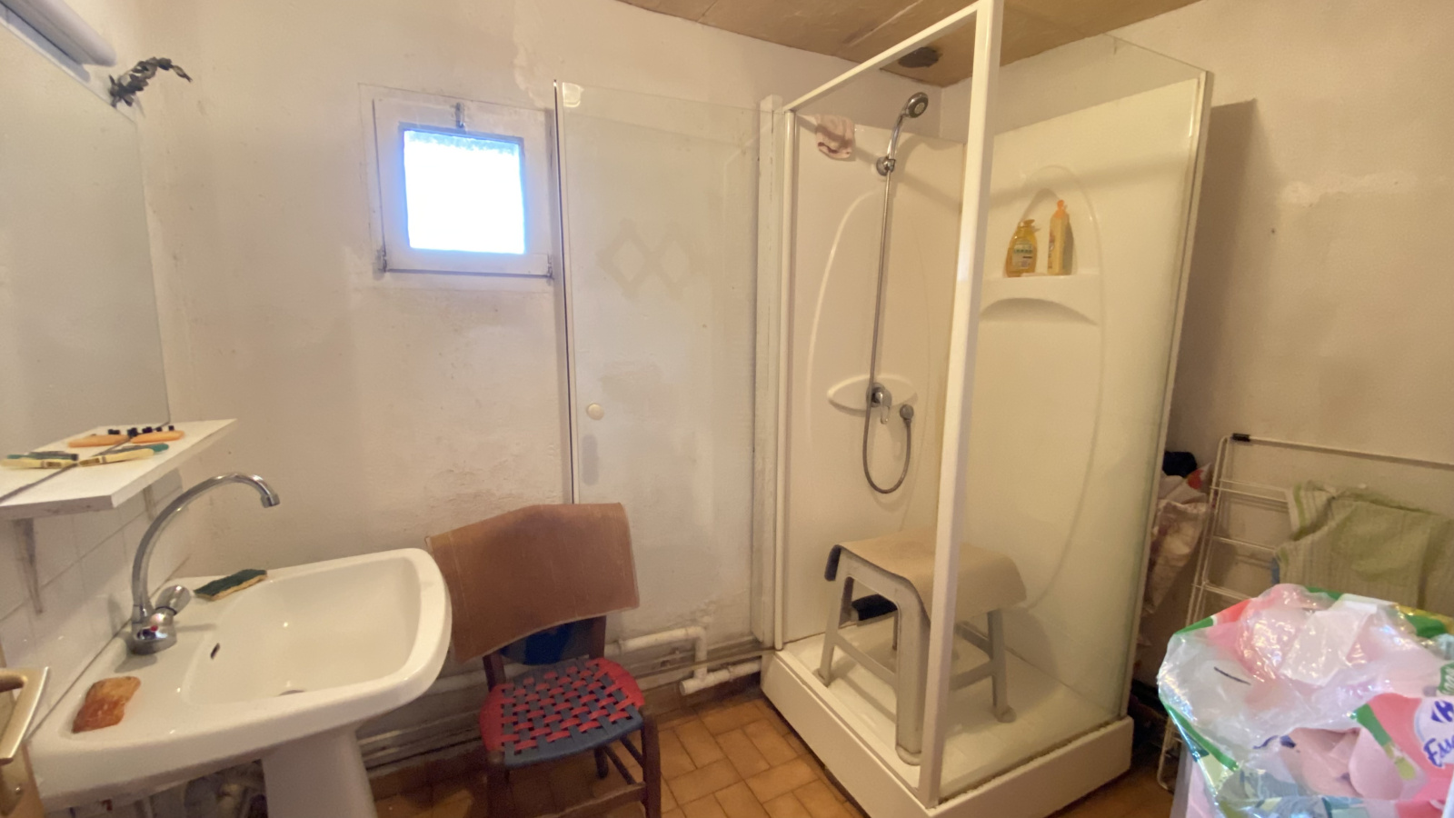 Cette maison ancienne de plain-pied T3 offre 58 m² habitables comprenant une pièce de vie avec cuisine et salle à manger, 2 chambres, une salle d'eau, WC séparé, chaufferie/buanderie.