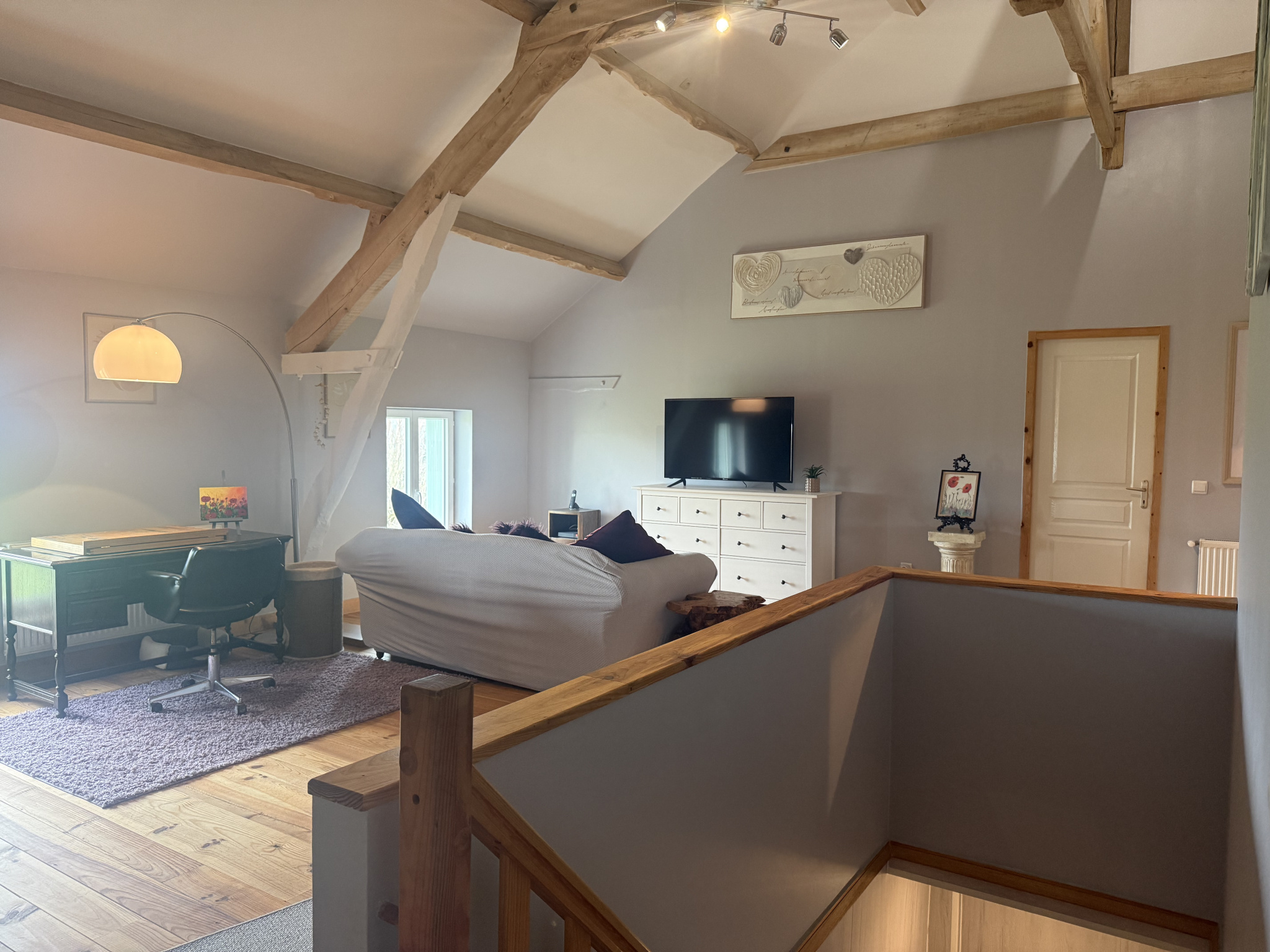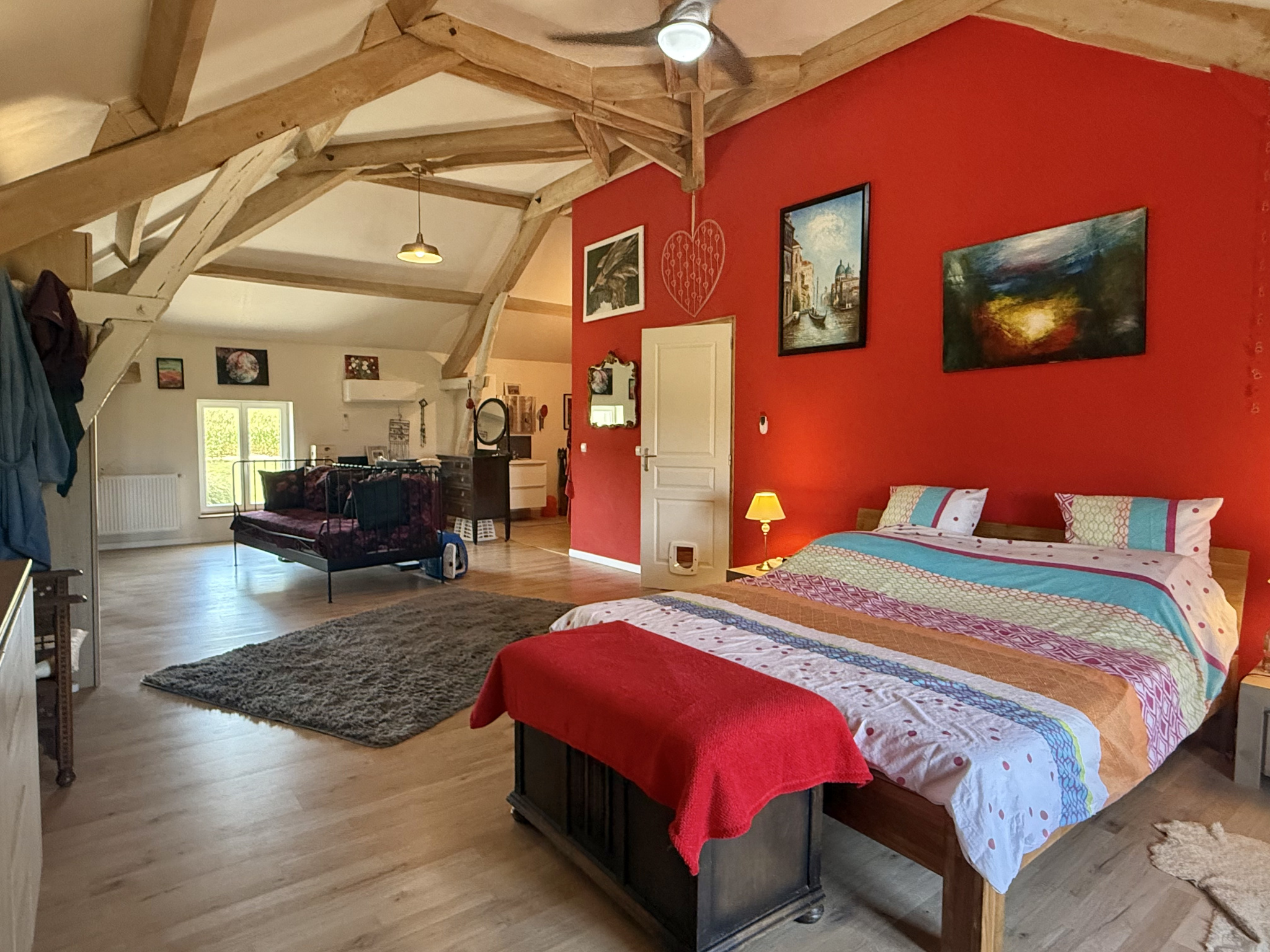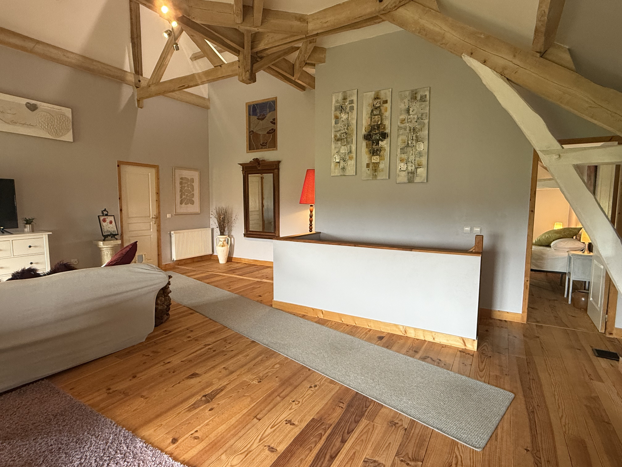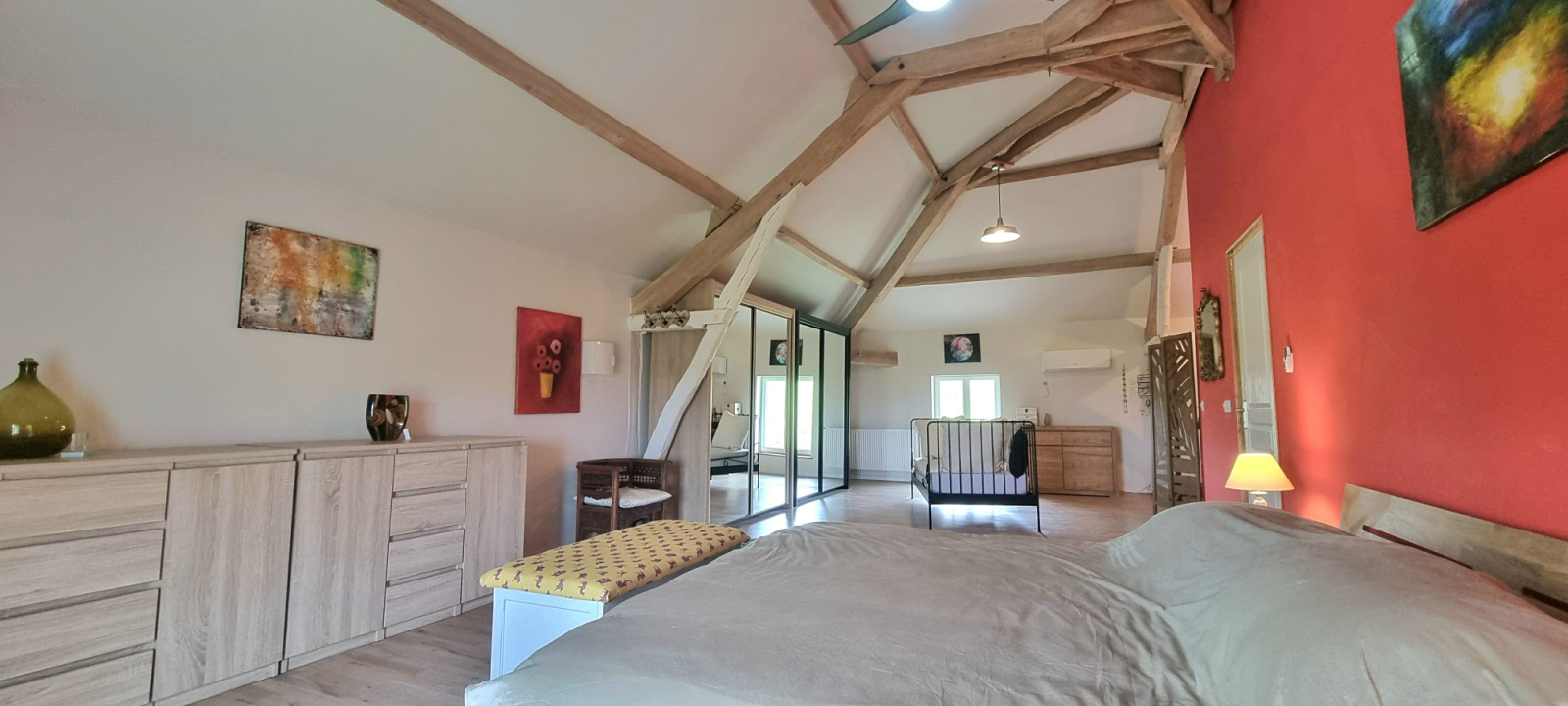 Une grande pièce polyvalente (40 m²) avec poutres apparentes et plafond de près de 5 m de haut, actuellement utilisée comme salle de cinéma et atelier créatif