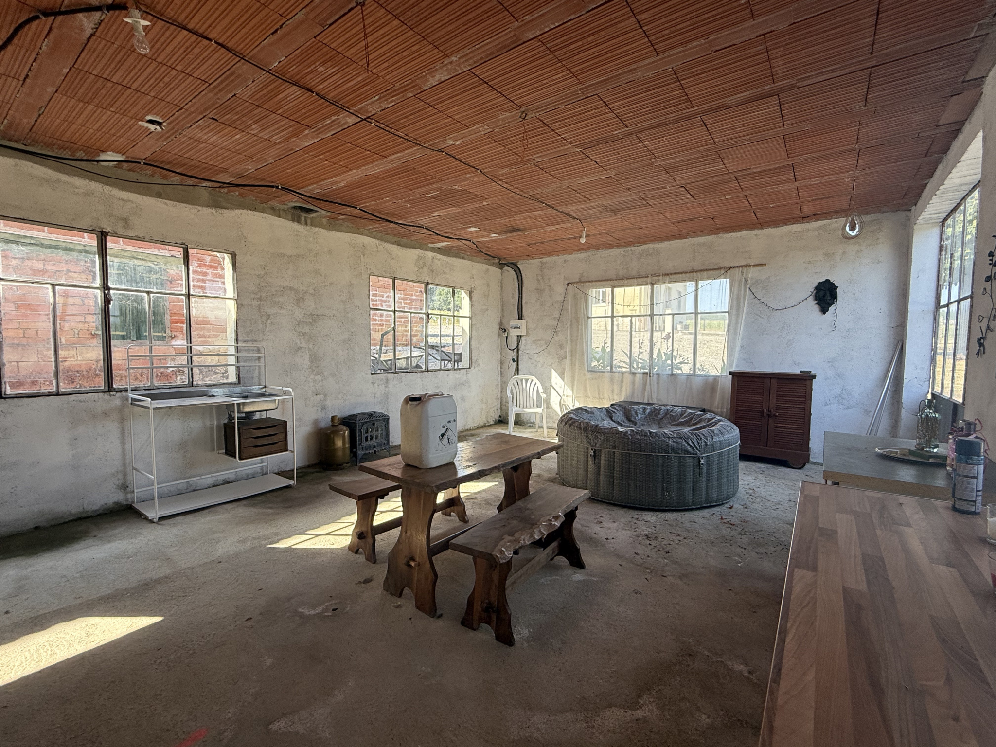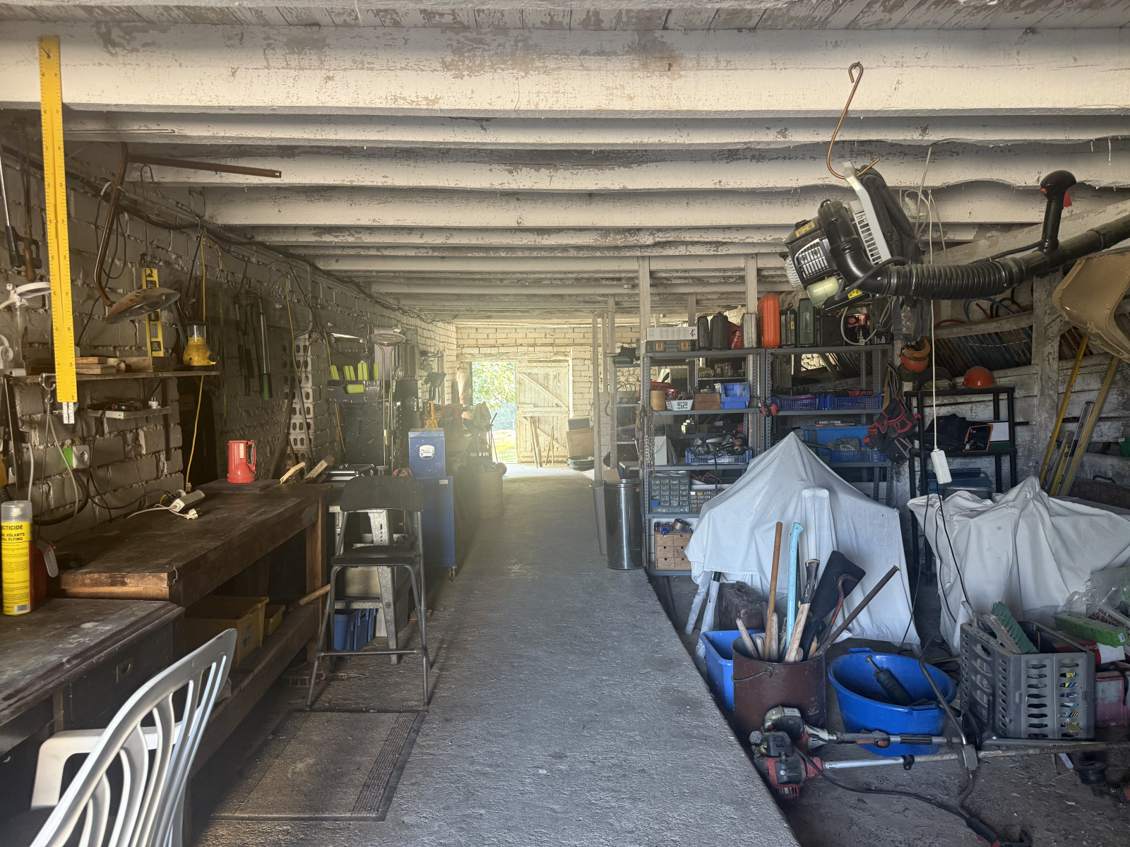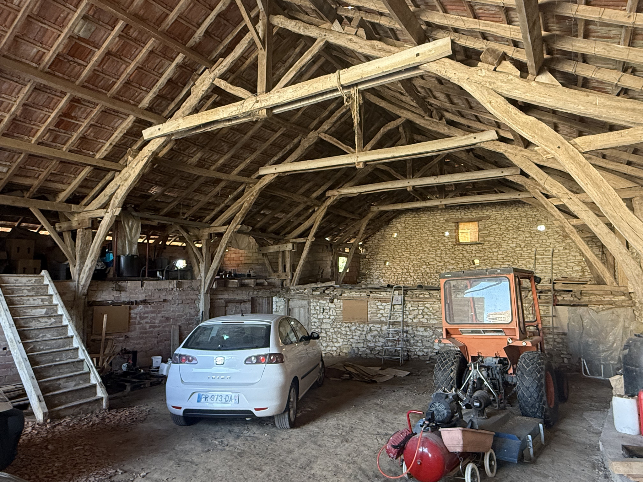 Cette grande maison familiale est située sur près de 2 hectares de terrain plat, sans voisins proches. Elle comprend une grange en pierre, un hangar à structure métallique, un garage et un atelier en parpaings, offrant de nombreux espaces pour le rangement, les loisirs ou les animaux.