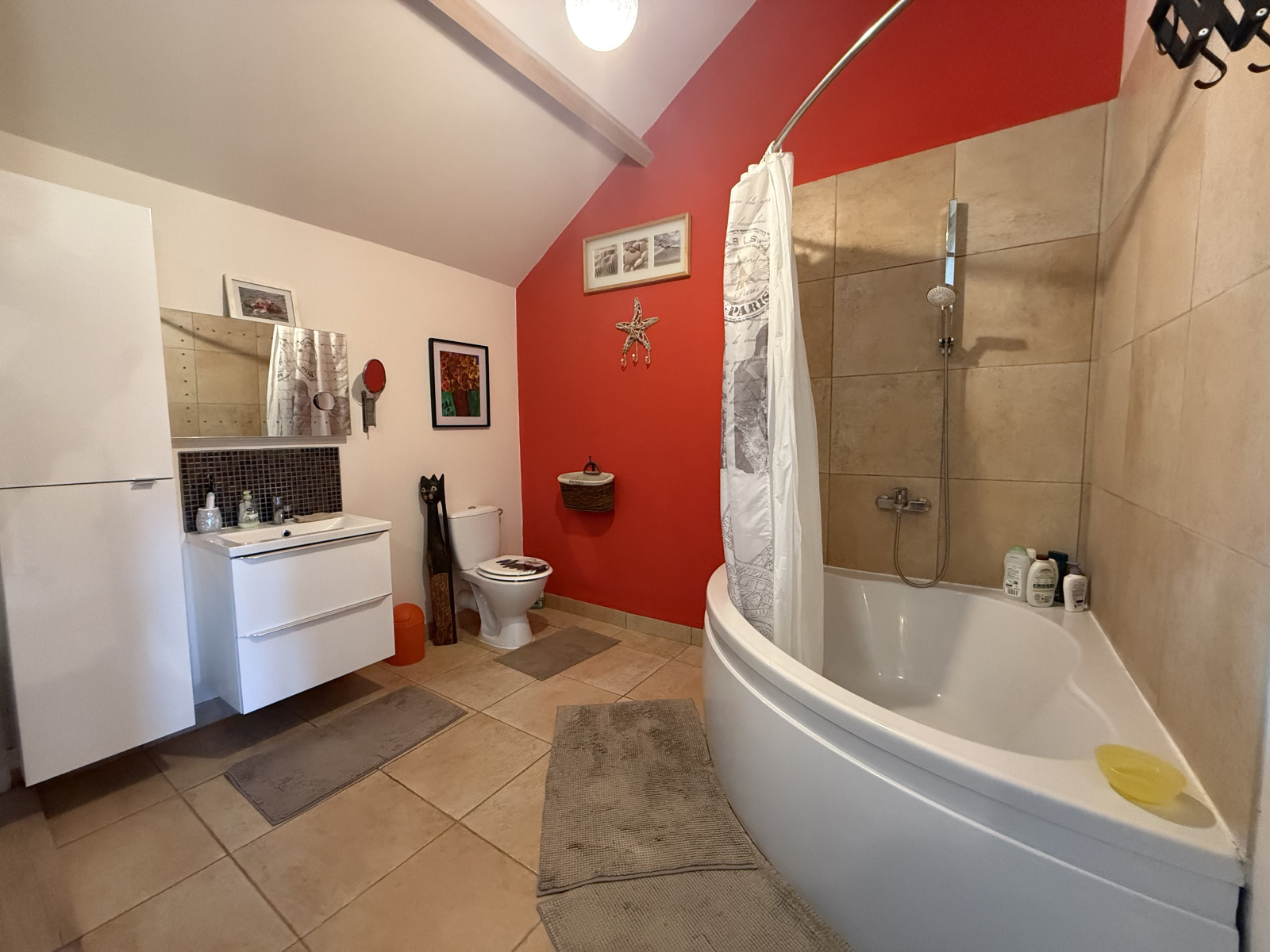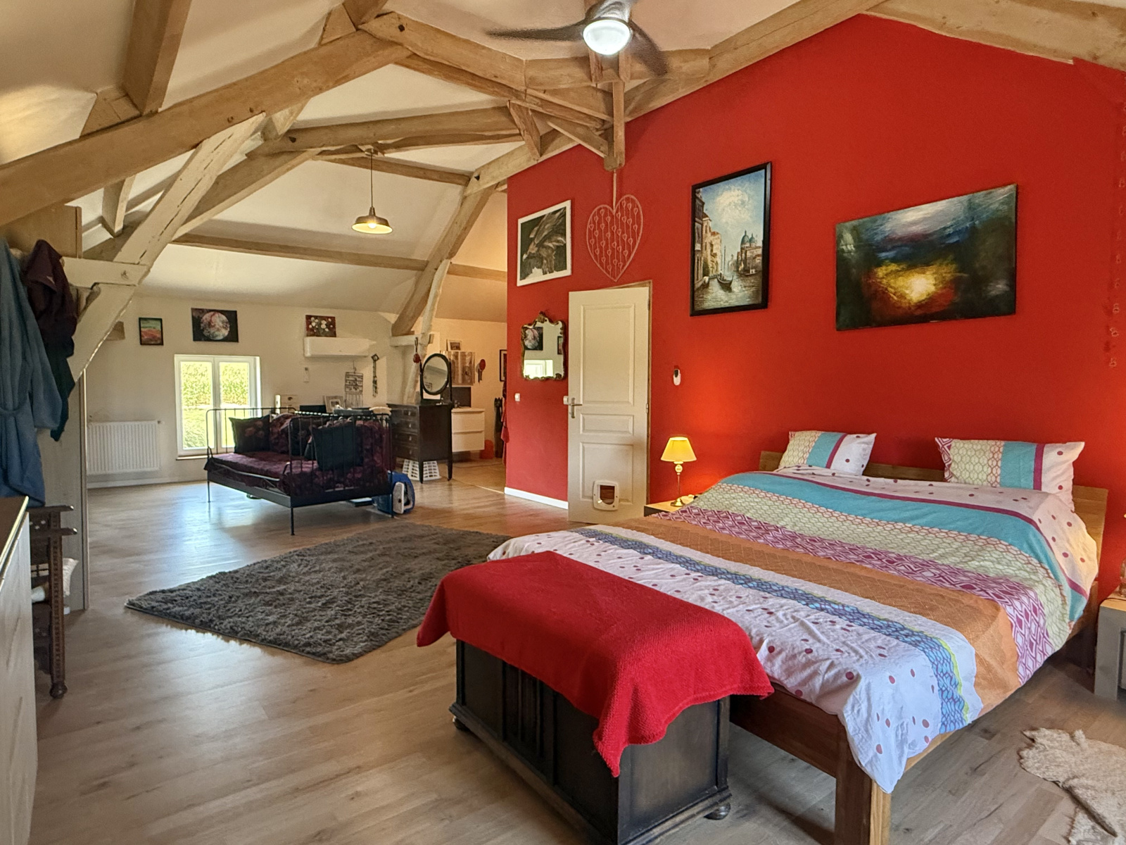 Une grande suite parentale (43 m²) avec plafond haut (3,66 m), climatisation réversible, ventilateur au plafond, et salle de bains attenante (7,3 m²) avec baignoire d’angle, lavabo et WC