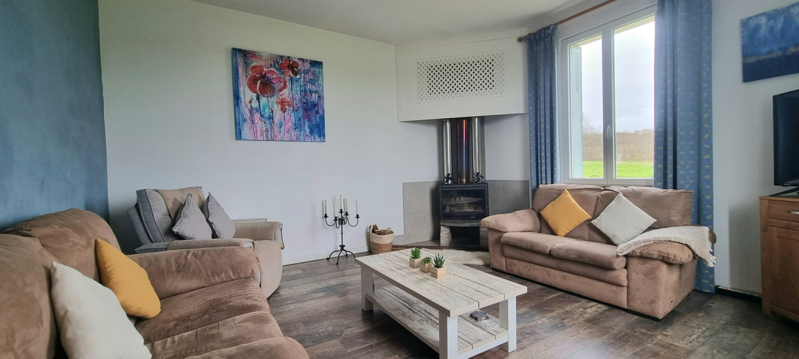 Un salon chaleureux (18 m²) avec double exposition et insert à bois distribuant l’air chaud dans toute la maison