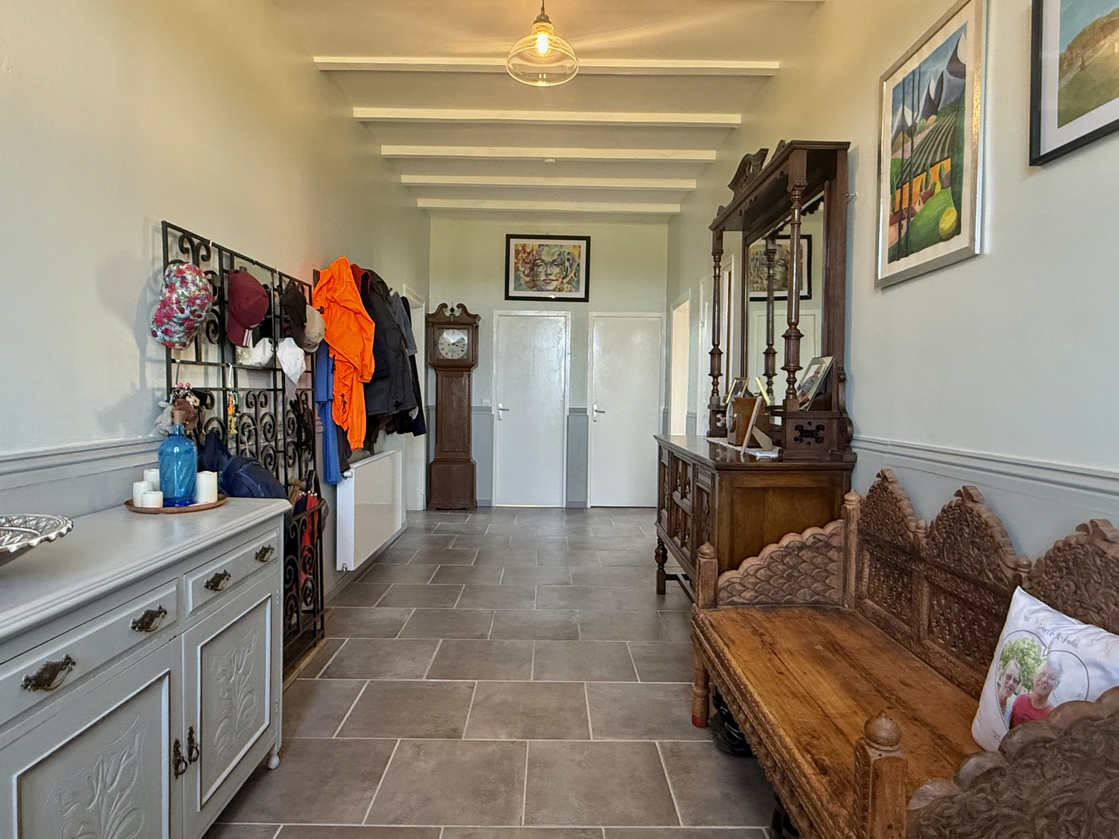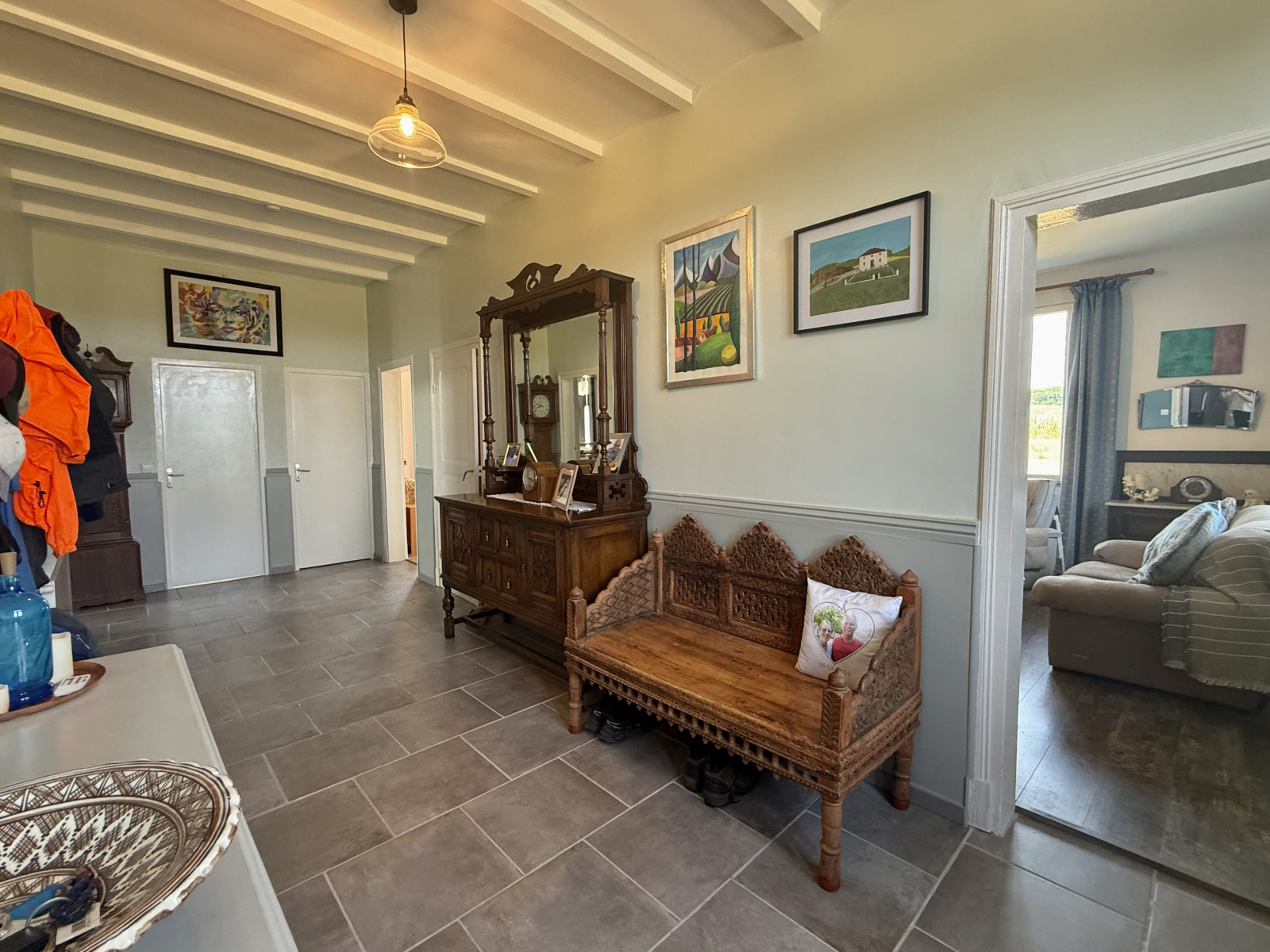 À l’intérieur, un large hall d’entrée (18 m²), typique d’une maison de maître, donne accès aux différentes pièces de part et d’autre. Sur la gauche, la salle à manger s’ouvre sur une grande cuisine ouverte (42 m²) avec îlot central. Une porte à l’arrière permet d’accéder aux dépendances.