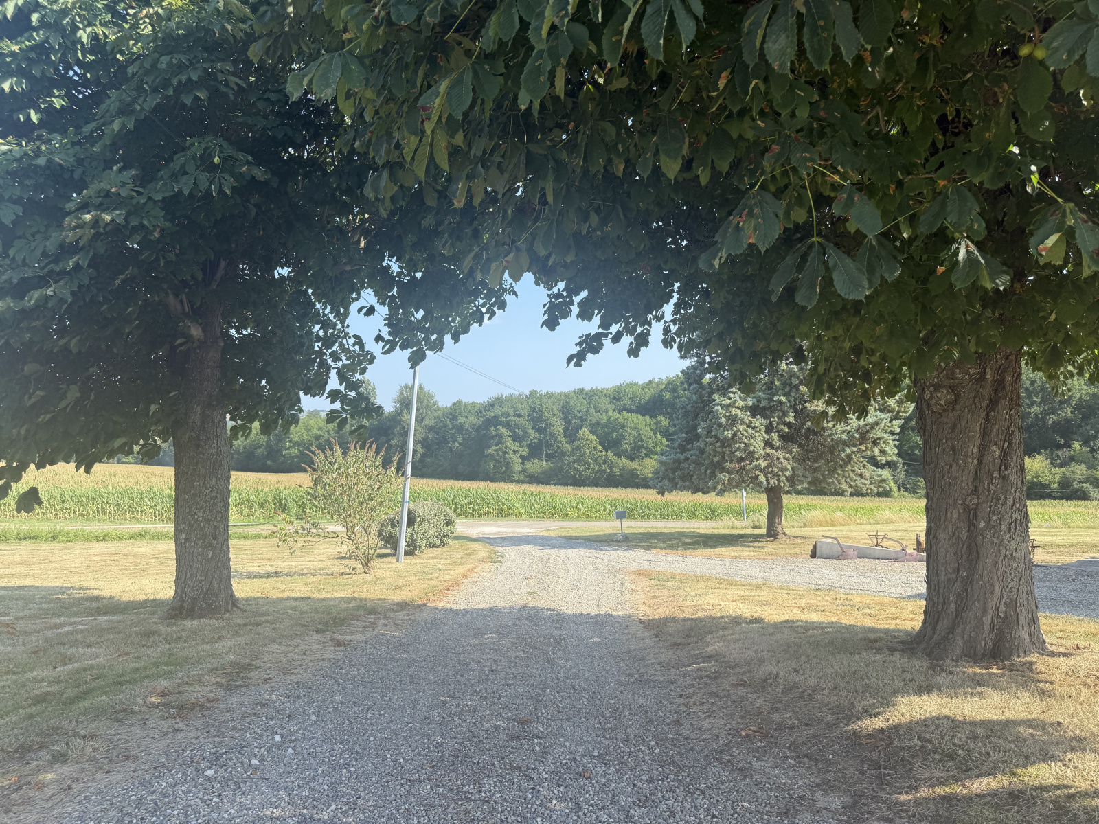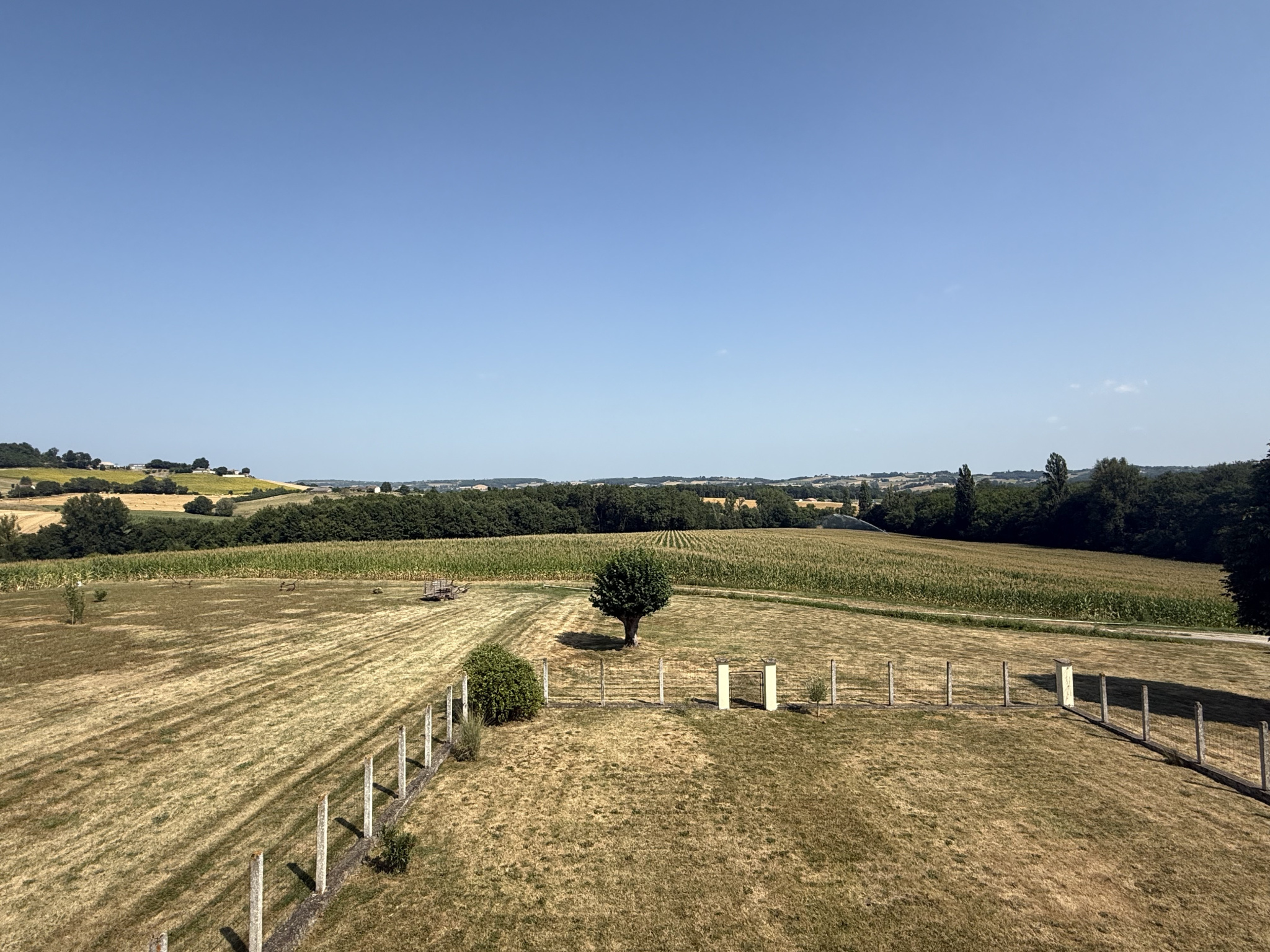 À l’extérieur : 1,937 hectare de pâturages plats, un puits, et une tranquillité totale.