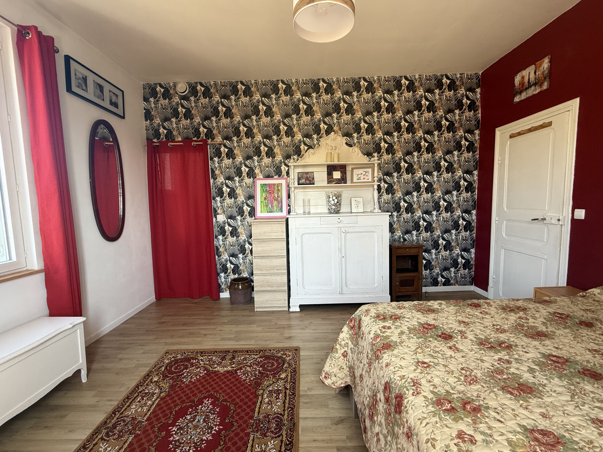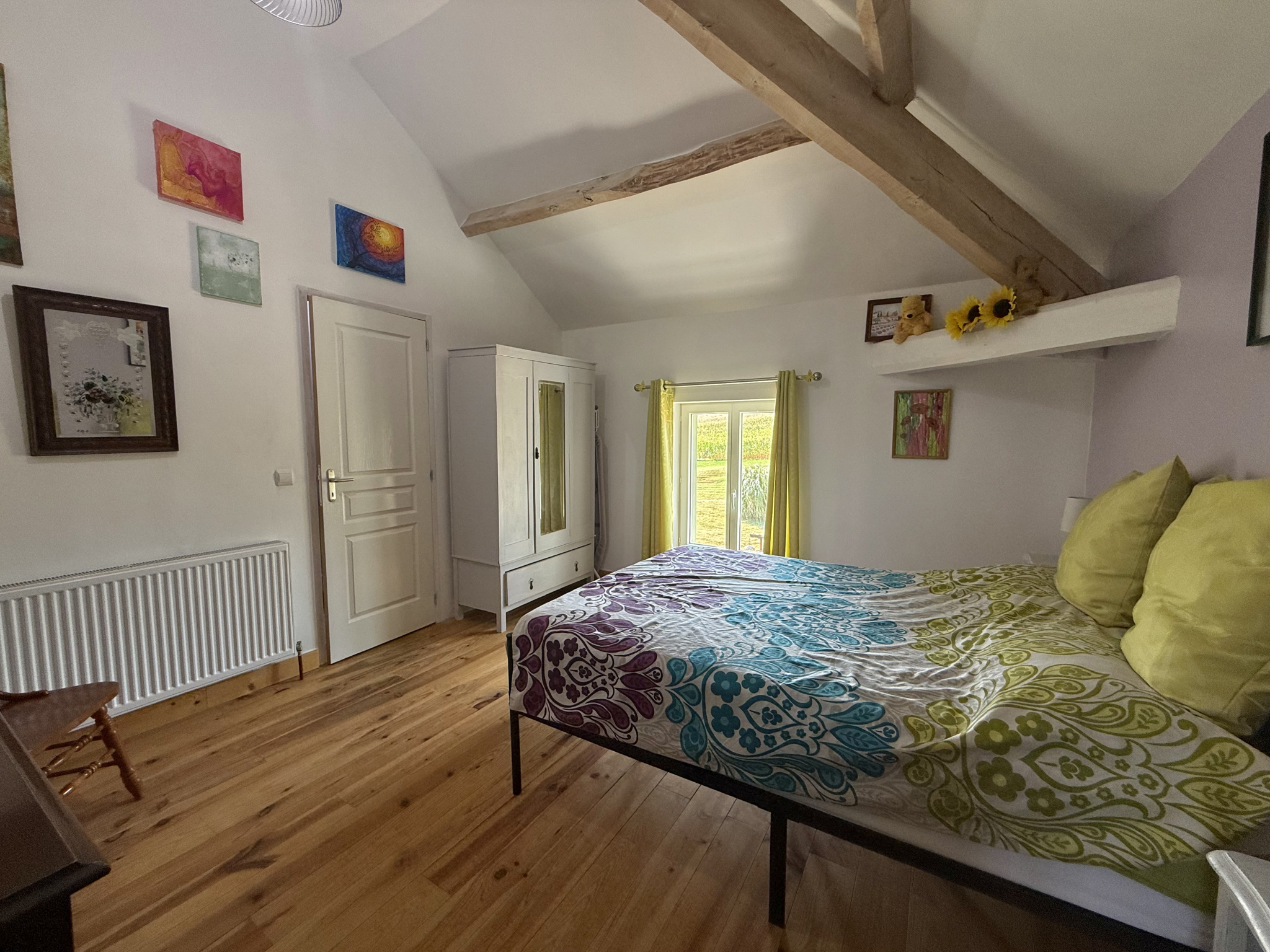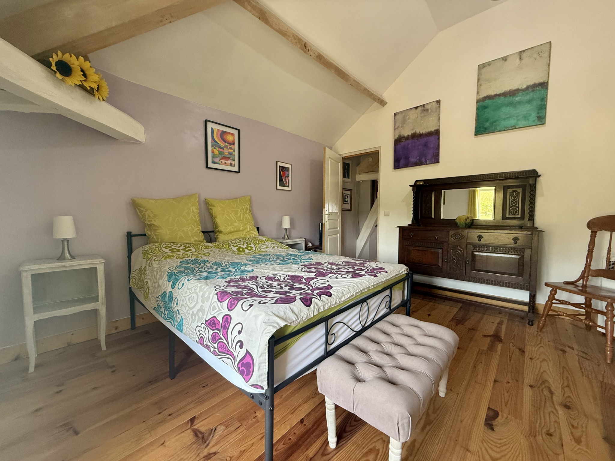 L’escalier, dissimulé derrière une porte dans le hall, mène à l’étage où se trouvent :