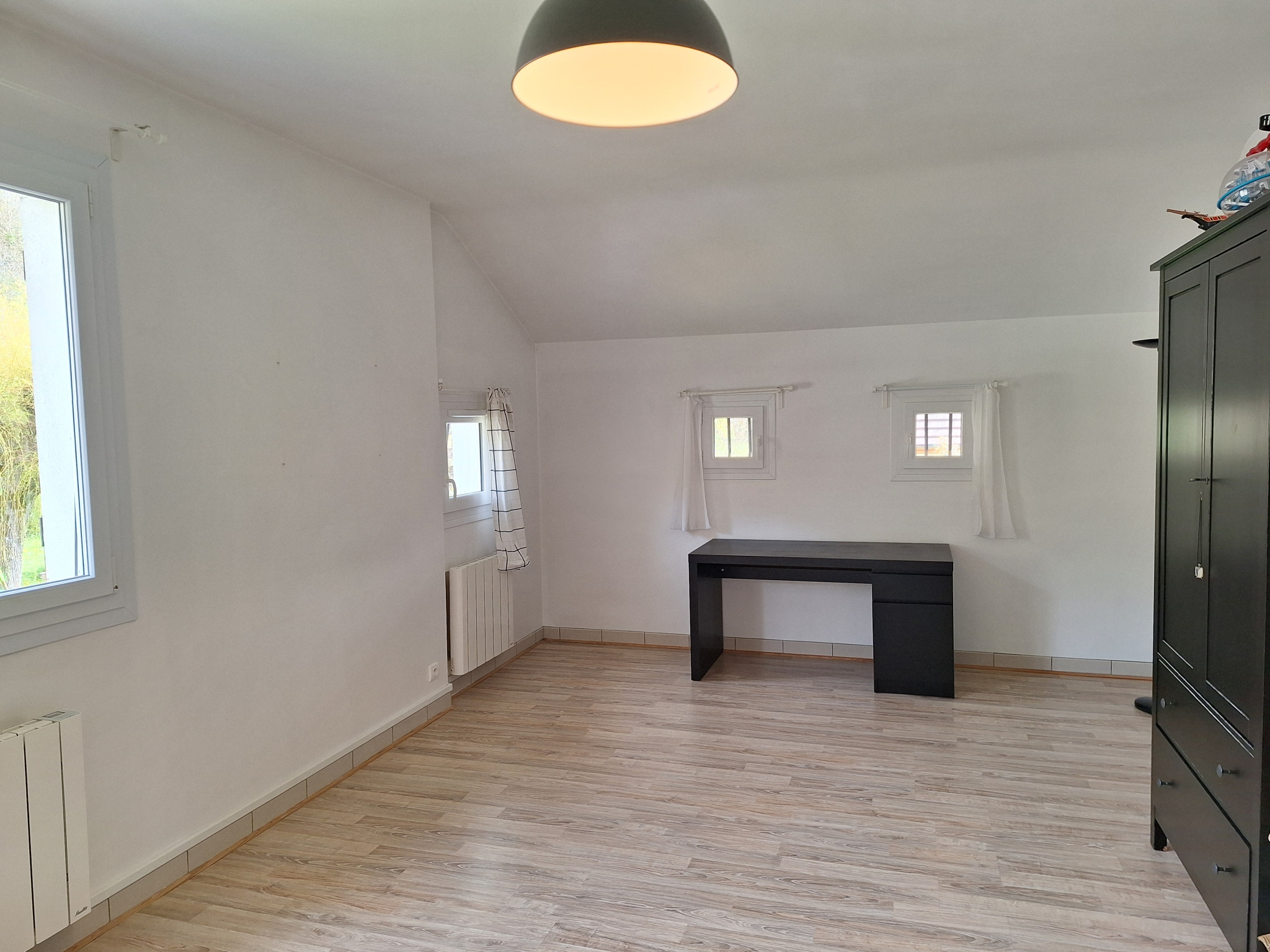 Entrée centrale avec une porte pour un accès escalier au deuxième niveau, 1 bureau de + de 10 m² pouvant être transformé en chambre et 2 autres chambres à l'est et Sud.