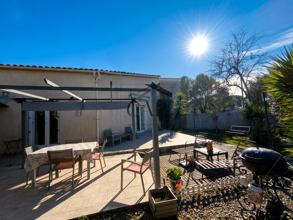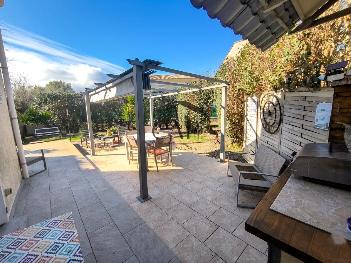 Le terrain, plat, arboré et entièrement clôturé, propose deux terrasses pour environ 50 m² d’espaces extérieurs, avec pergola, cuisine d’été et espace barbecue/plancha.