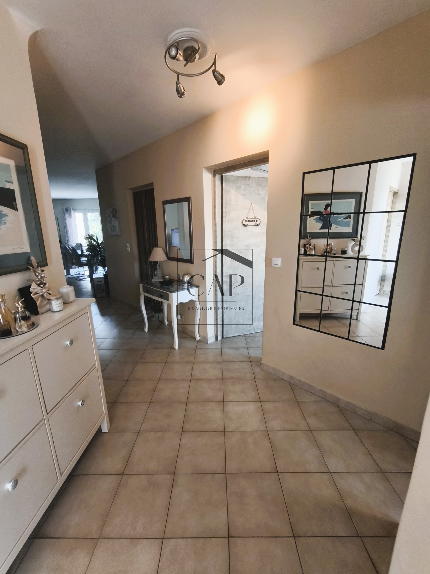 Édifiée sur deux niveaux, la maison propose au rez-de-chaussée une entrée avec rangements et cellier, un vaste séjour climatisé d’environ 40 m² avec insert, ouvert sur une première terrasse d’environ 30 m², ainsi qu’une cuisine indépendante de 18 m² semi-ouverte sur la pièce de vie.