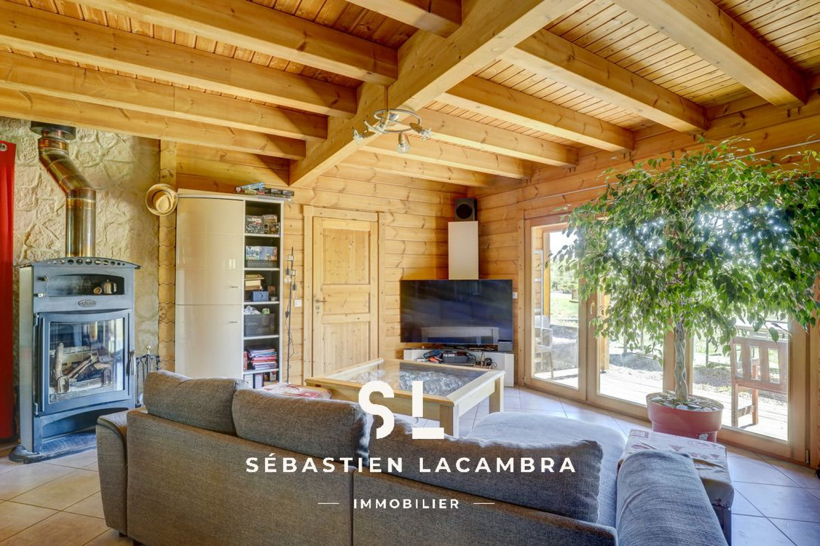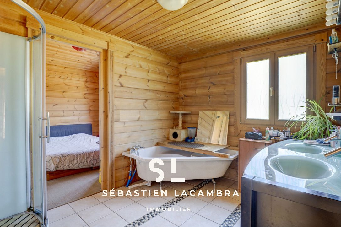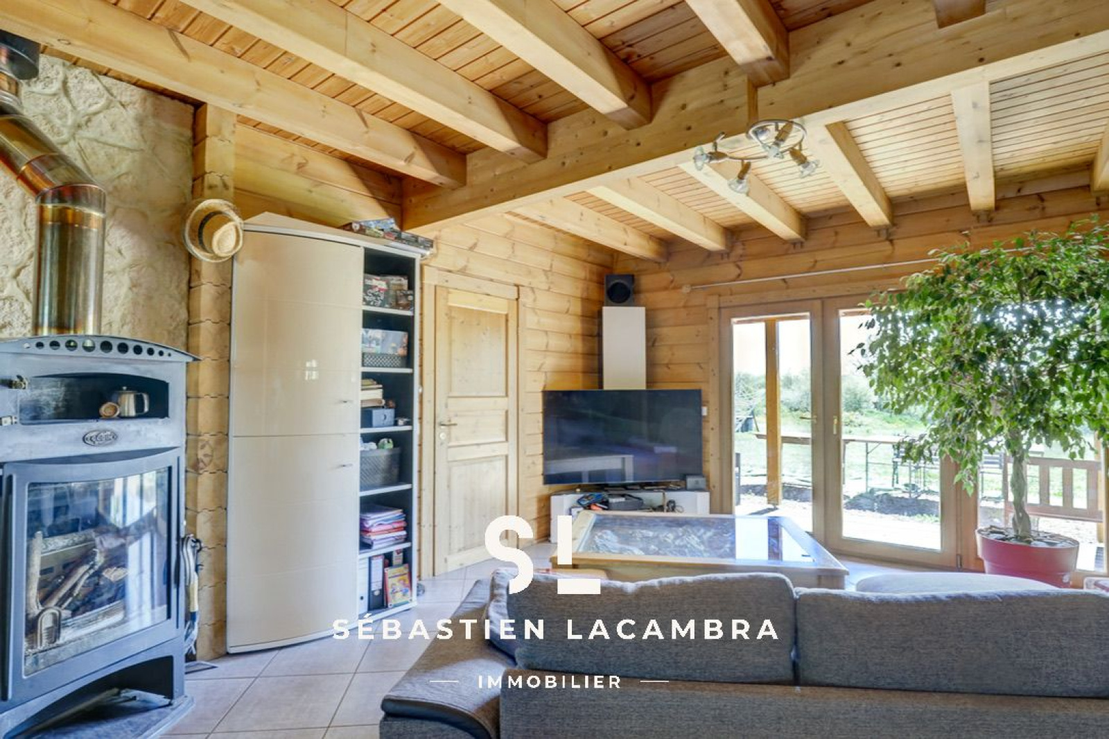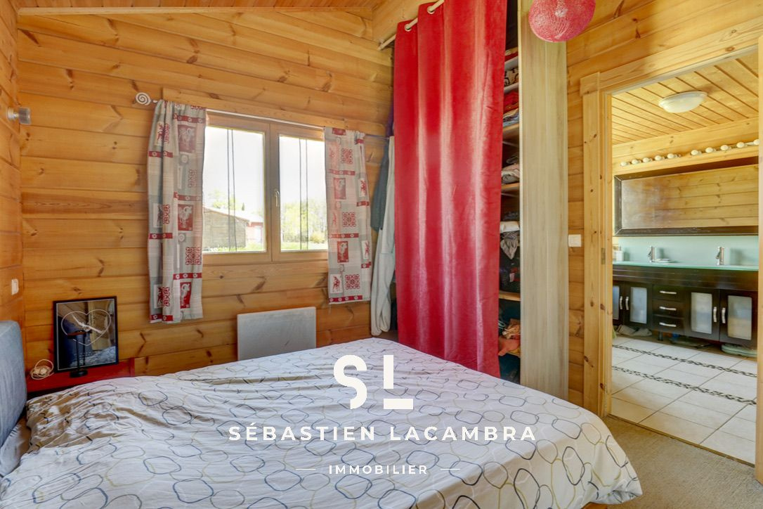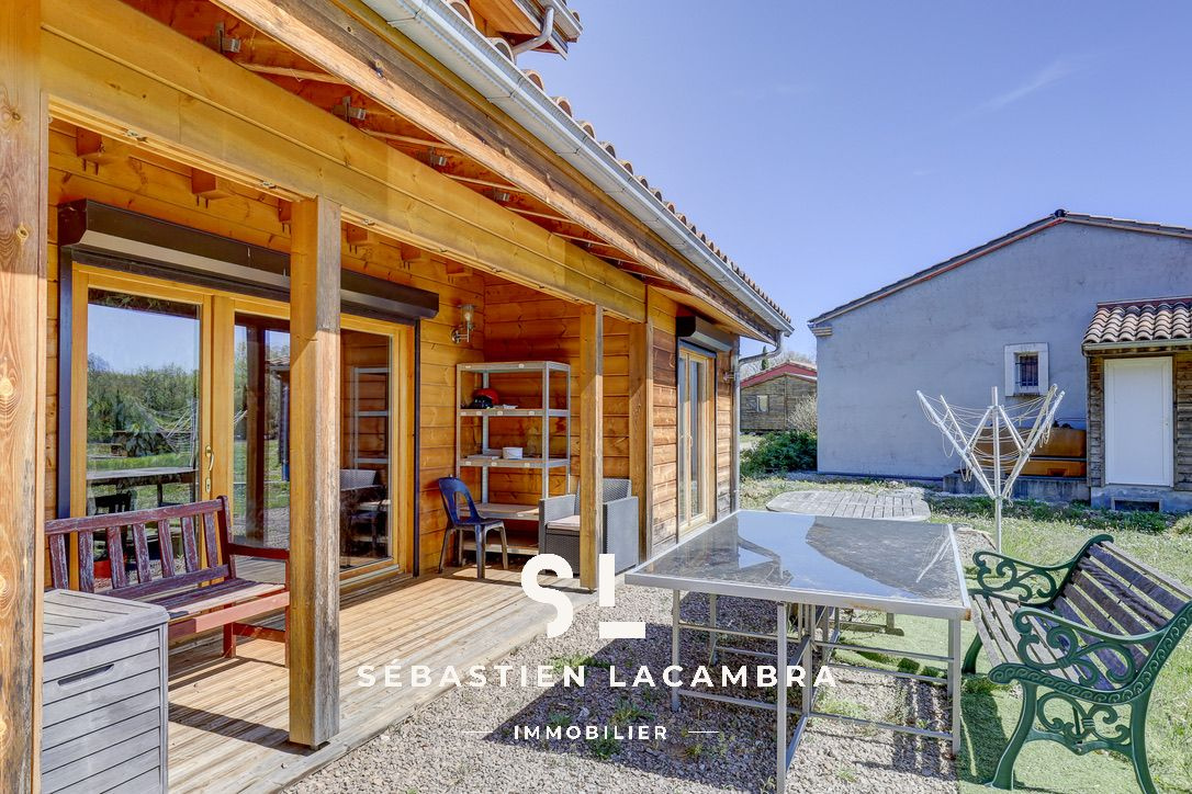 Les équipements contribuent au confort quotidien : poêle à bois, chauffage électrique d’appoint, volets roulants électriques et menuiseries bois en double vitrage. À l’extérieur, une terrasse couverte d’environ 35 m² prolonge naturellement l’espace de vie.