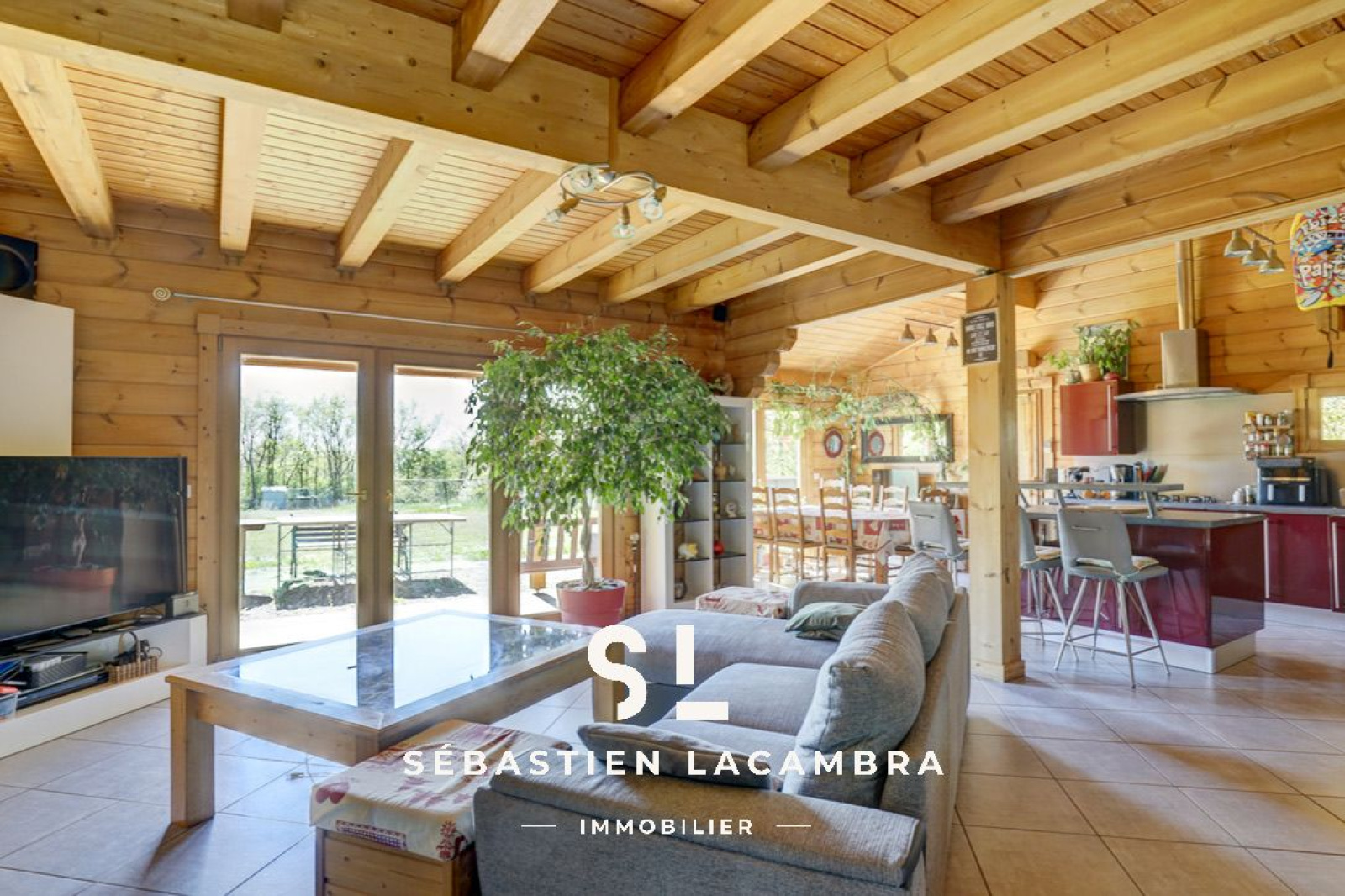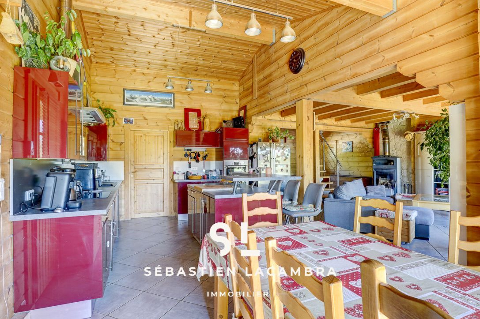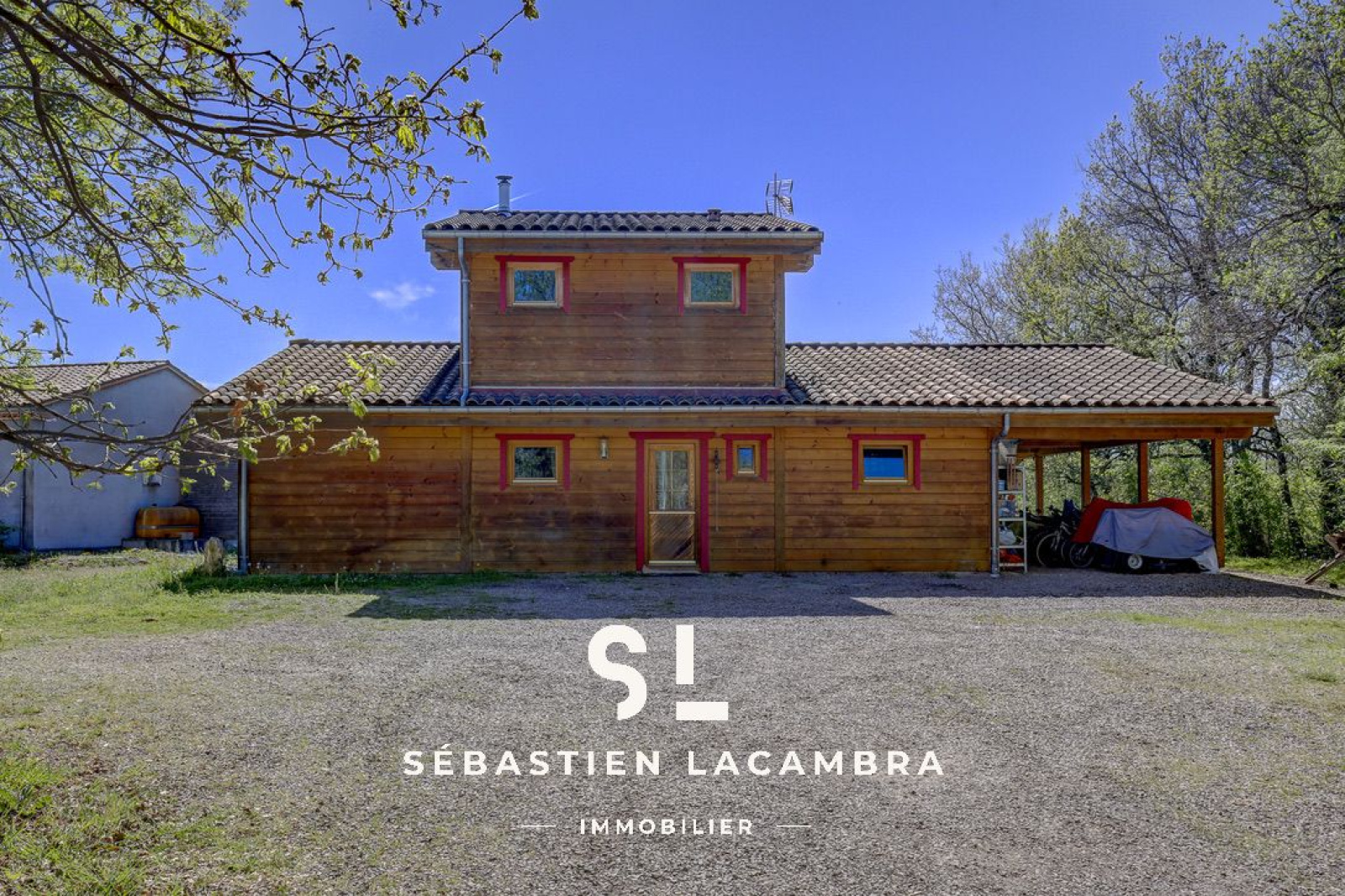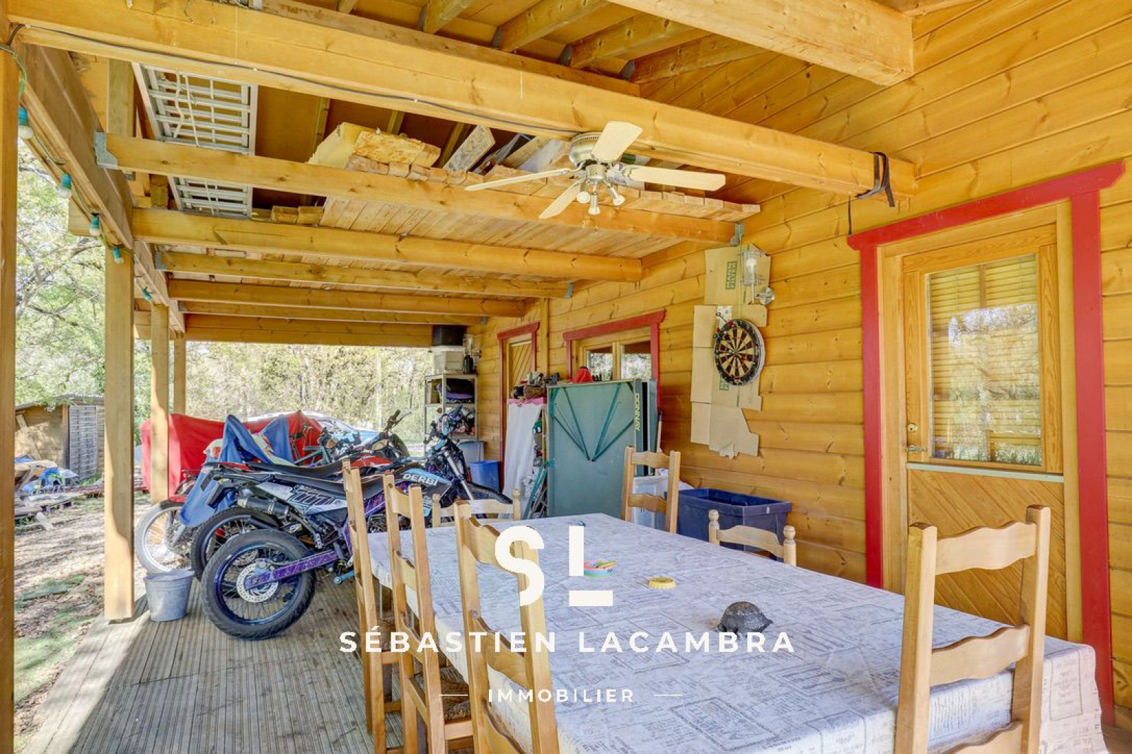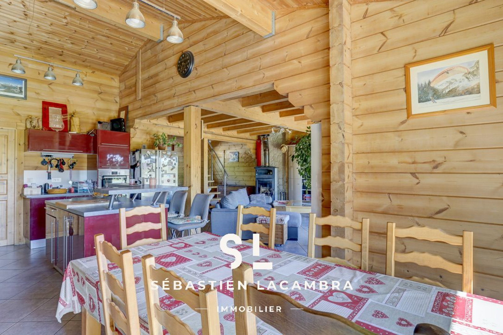 Les équipements contribuent au confort quotidien : poêle à bois, chauffage électrique d’appoint, volets roulants électriques et menuiseries bois en double vitrage. À l’extérieur, une terrasse couverte d’environ 35 m² prolonge naturellement l’espace de vie.