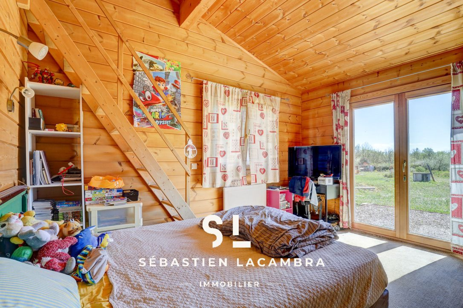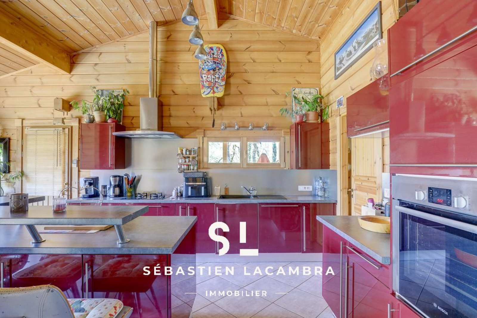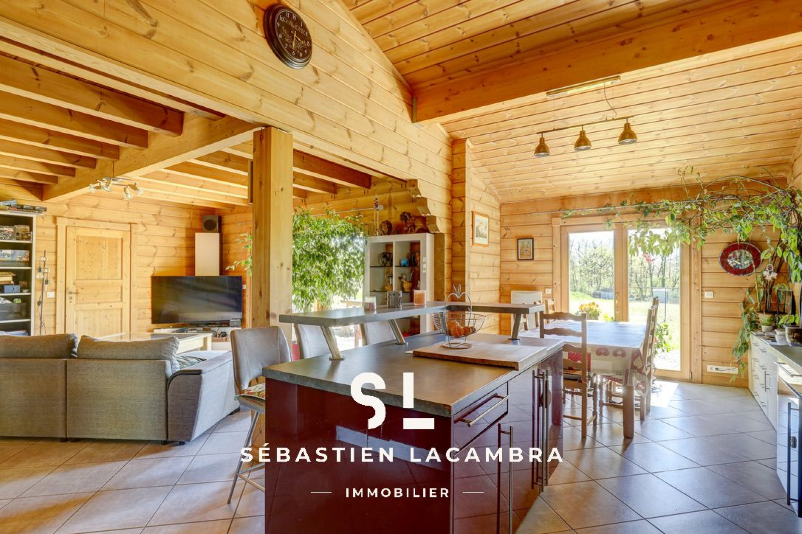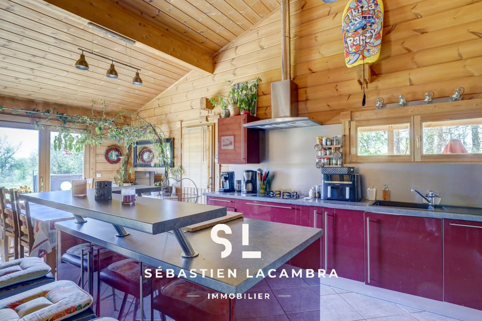 Les équipements contribuent au confort quotidien : poêle à bois, chauffage électrique d’appoint, volets roulants électriques et menuiseries bois en double vitrage. À l’extérieur, une terrasse couverte d’environ 35 m² prolonge naturellement l’espace de vie.