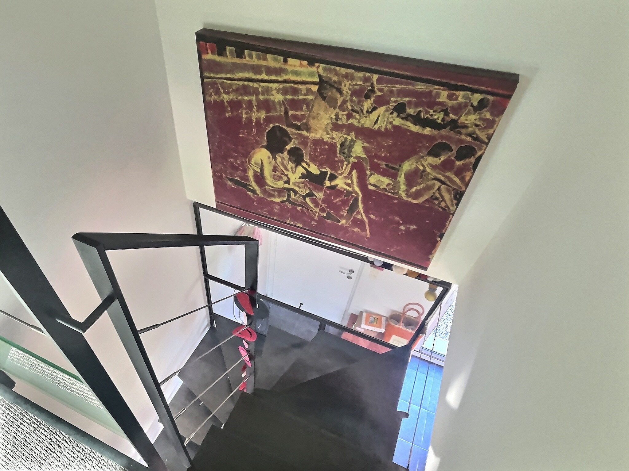 À l’étage, accessible par un escalier en métal au design remarquable, véritable pièce maîtresse de la maison, vous découvrirez 3 chambres mansardées, dont 2 exposées sud, dont une disposant de sa salle d’eau avec WC et une seconde salle d’eau avec WC.