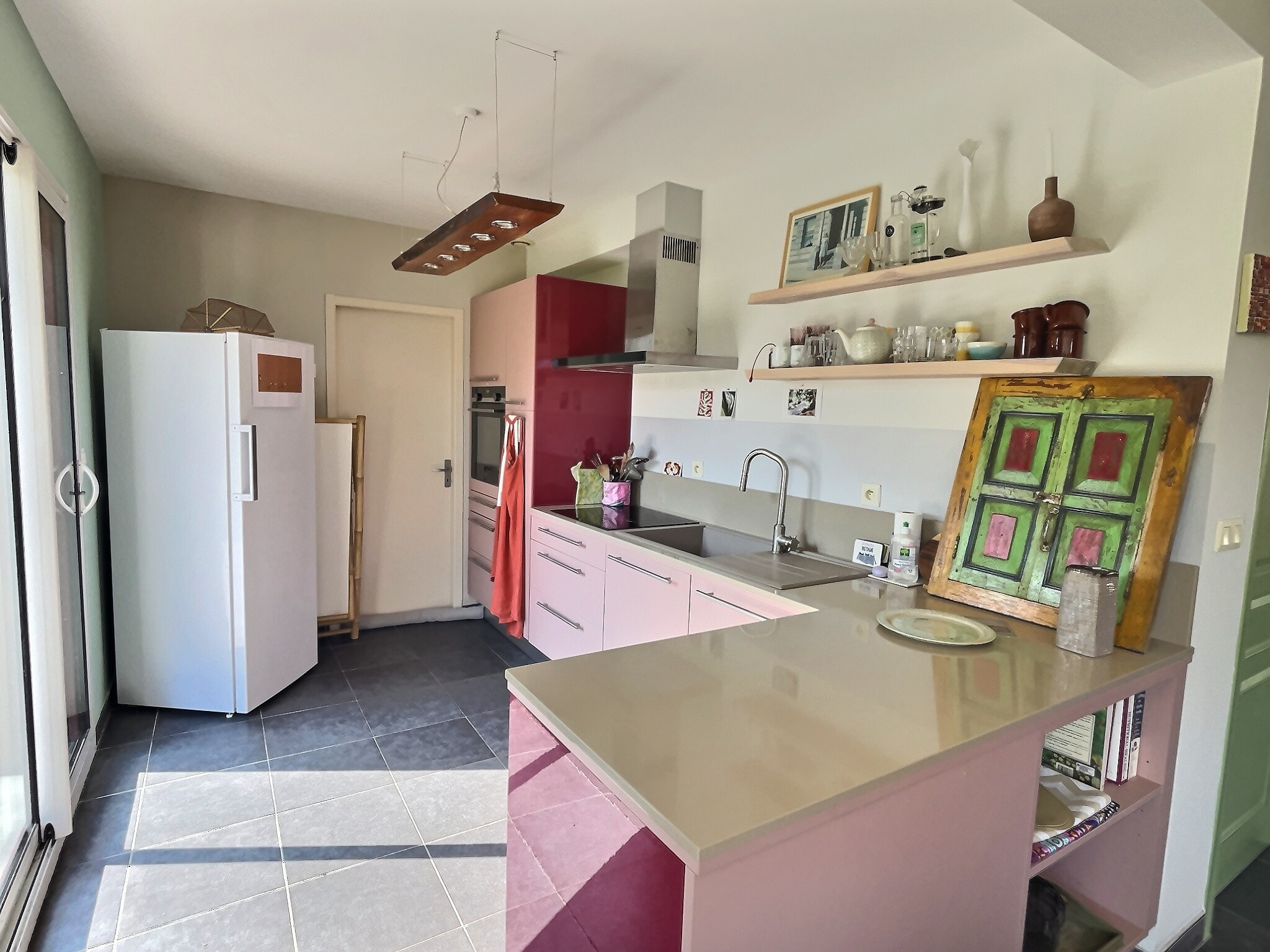 La cuisine ouverte, aménagée et équipée, s’intègre parfaitement à un séjour chaleureux et lumineux, baigné de lumière grâce à son bow-window exposé sud et son accès à la terrasse et à la véranda.