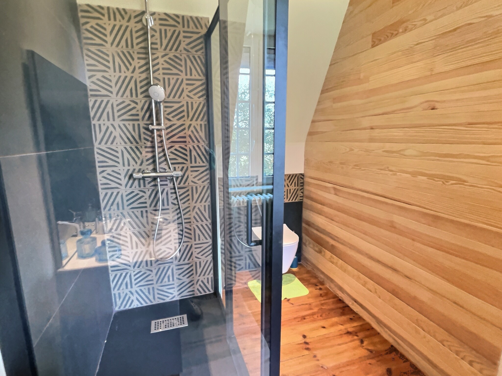 Sous les combles, une suite parentale baignée de lumière, avec douche et WC, offre un espace intime et paisible.