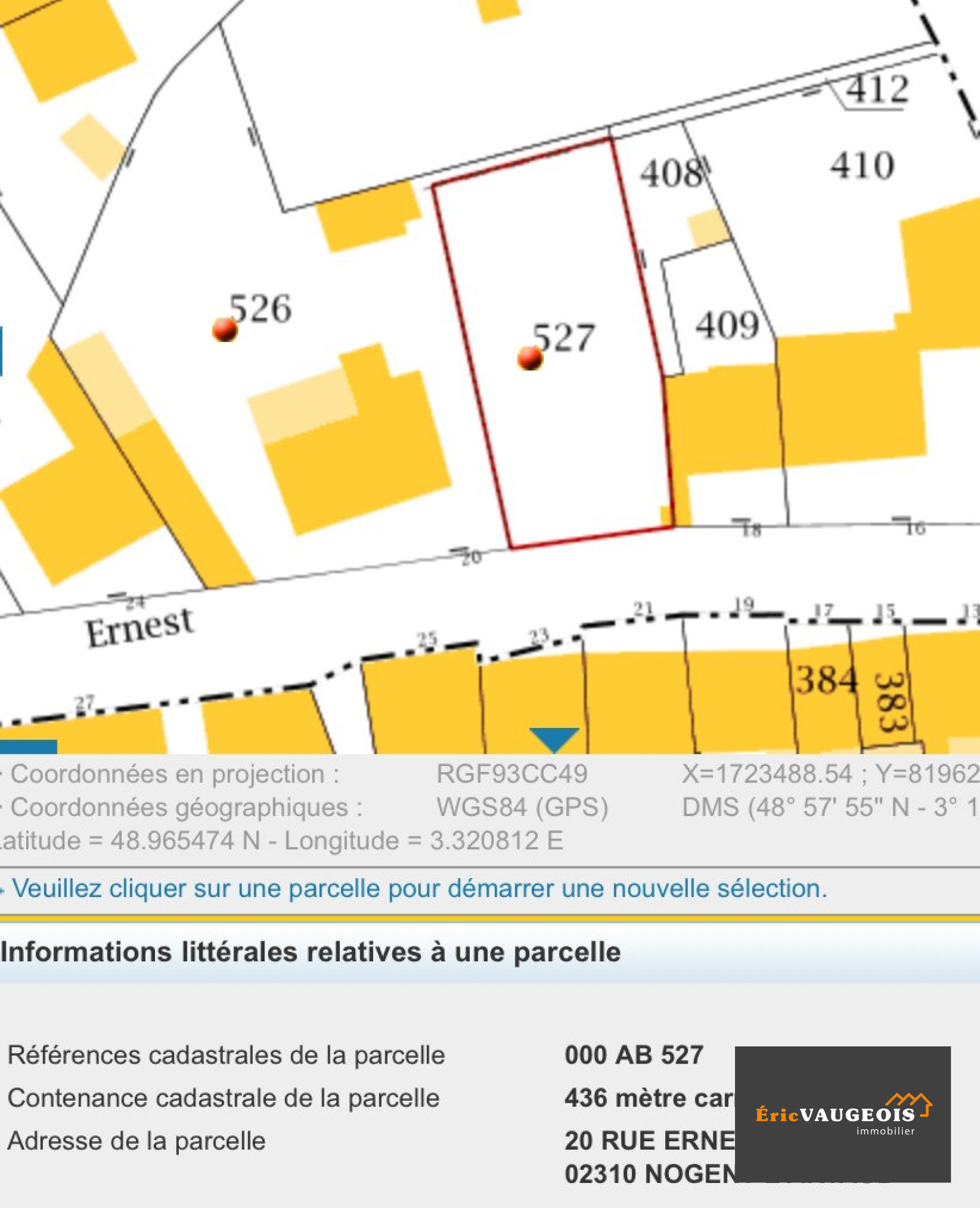 EXCLUSIVITÉ de l'agence Eric VAUGEOIS immobilier à Coulommiers au milieu de la rue piètonne. Éric VAUGEOIS vous propose ce terrain à batîr d'environ 436 m² en zone UA du PLU. Il est plat, clos, arboré et dans une rue au calme à deux pas du centre ville de Nogent l'Artaud (02310) au 18 bis rue Ernest Vallée avec toutes ses commodités sur place. Gare à pied à 400 m environ pour rejoindre PARIS Gare de l'Est en moins d'une heure ! Façade de 13 m environ. Tout-à -l'égout, gaz de ville et Fibre internet très haut débit sur rue. Informations complémentaires et visite sur RDV !