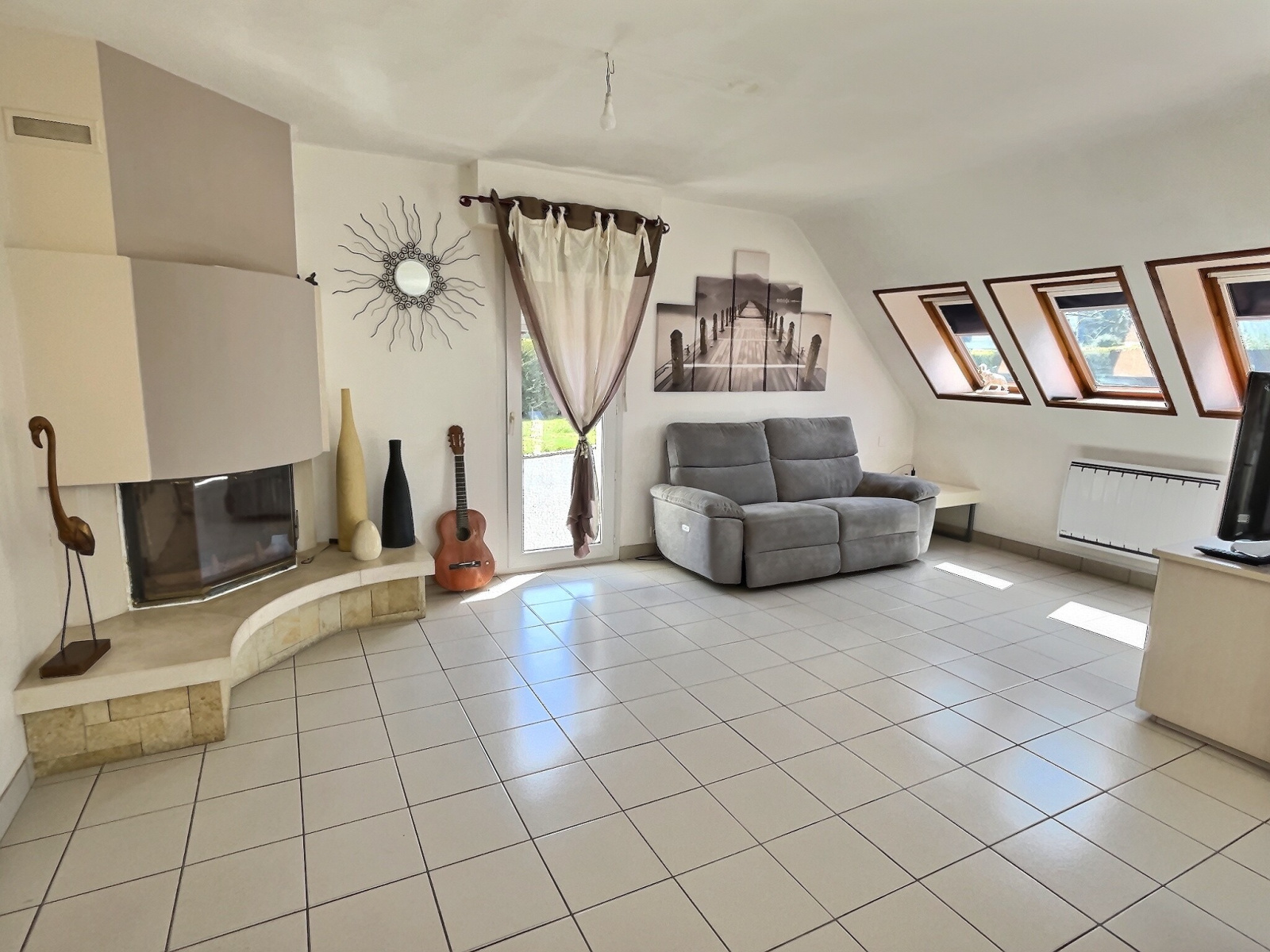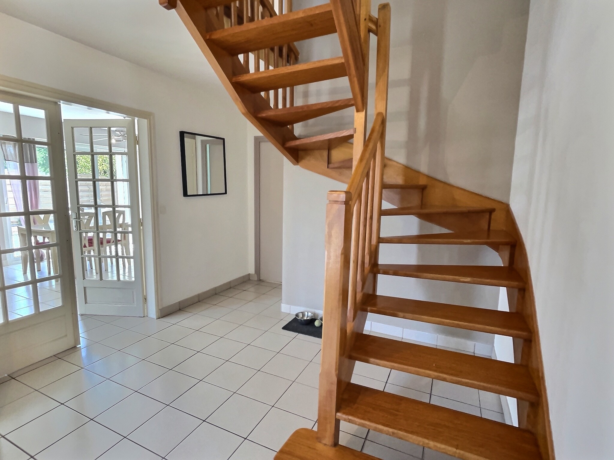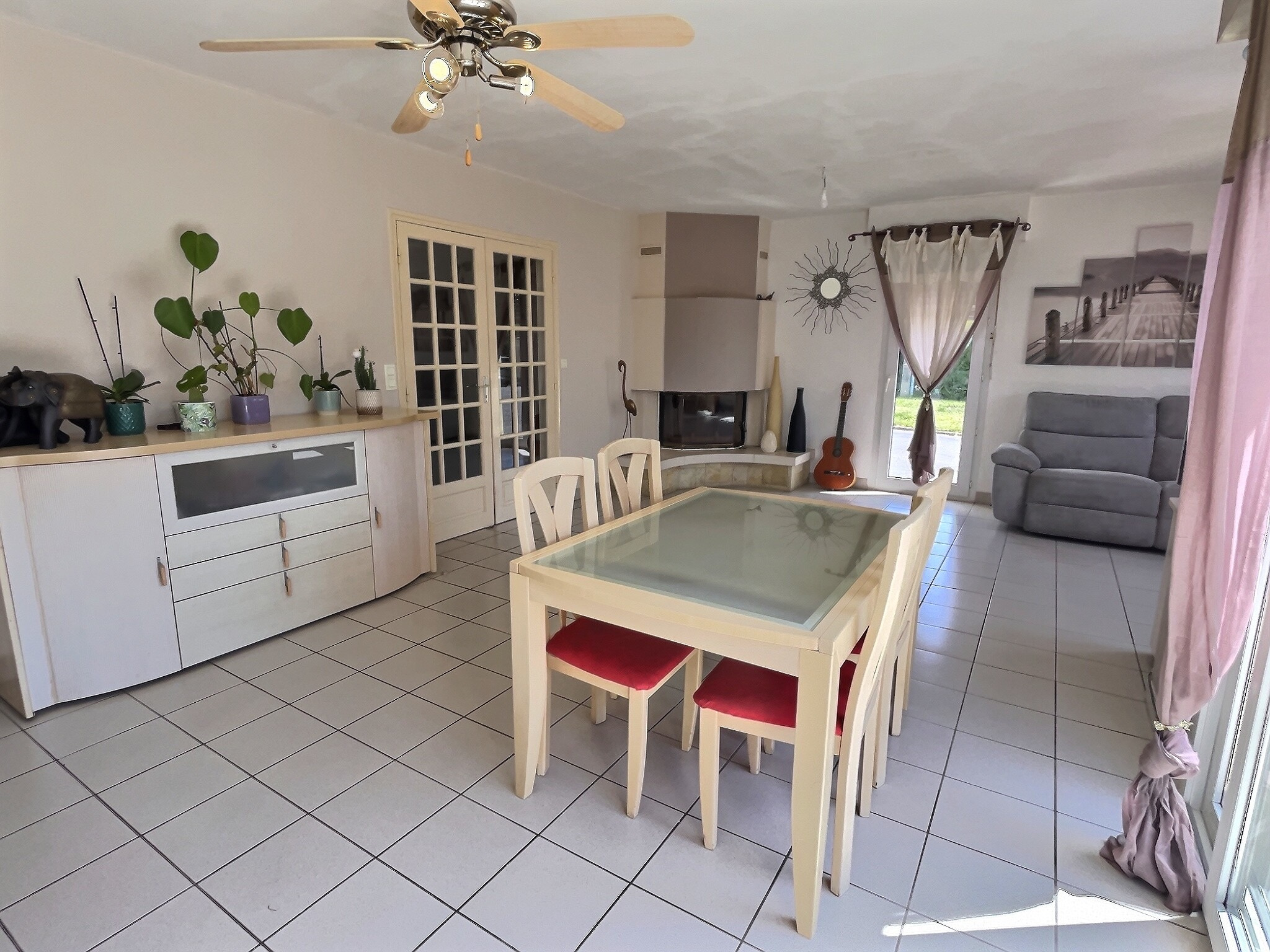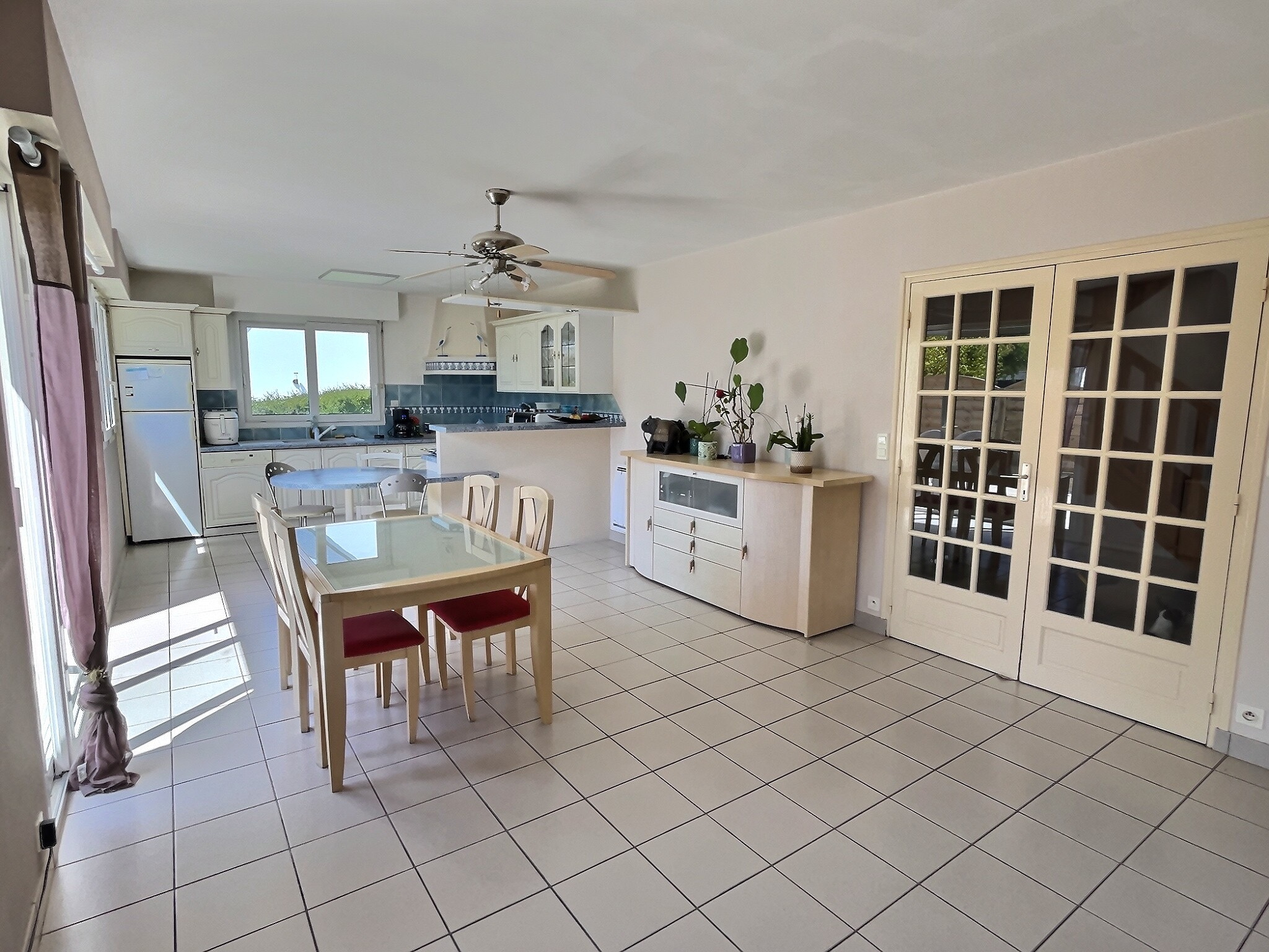 Dans la maison, un grand hall d’entrée dessert un séjour très clair avec cuisine aménagée, coin repas menant sur une terrasse et coin salon avec cheminé et insert.. Une chambre avec salle d’eau privative et wc séparé complète le niveau.