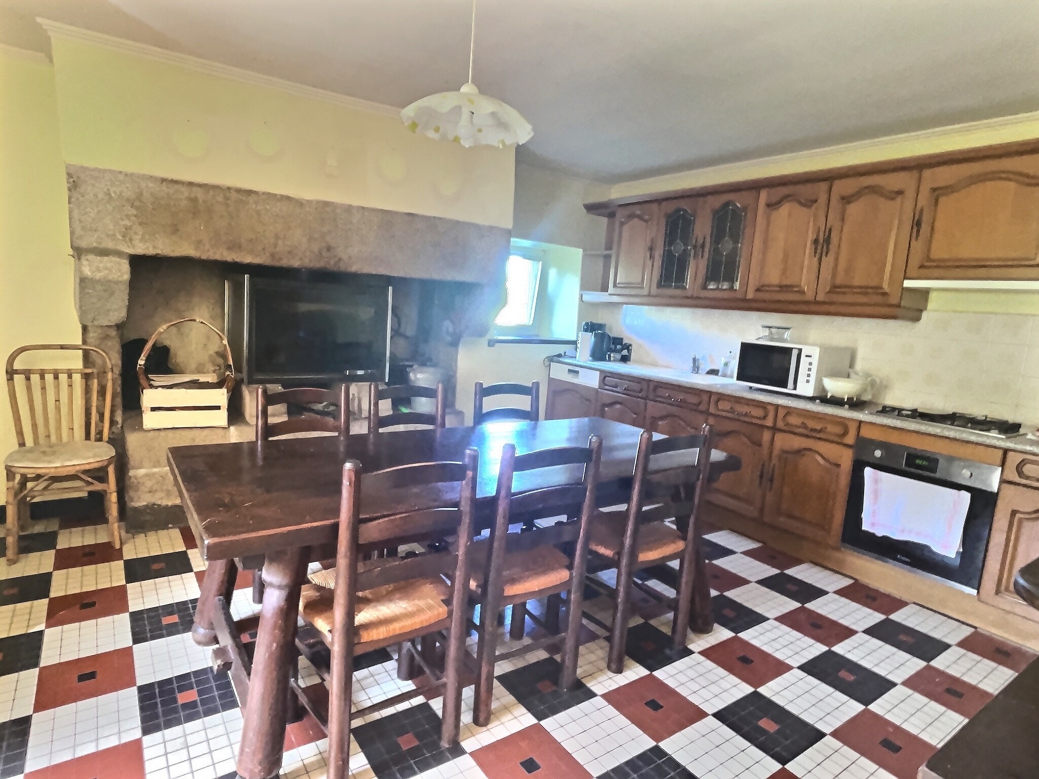 - Une entrée desservant une cuisine avec une belle cheminée devant un coin repas, un salon, une salle d’eau, un wc ainsi qu’un cellier au RDC.