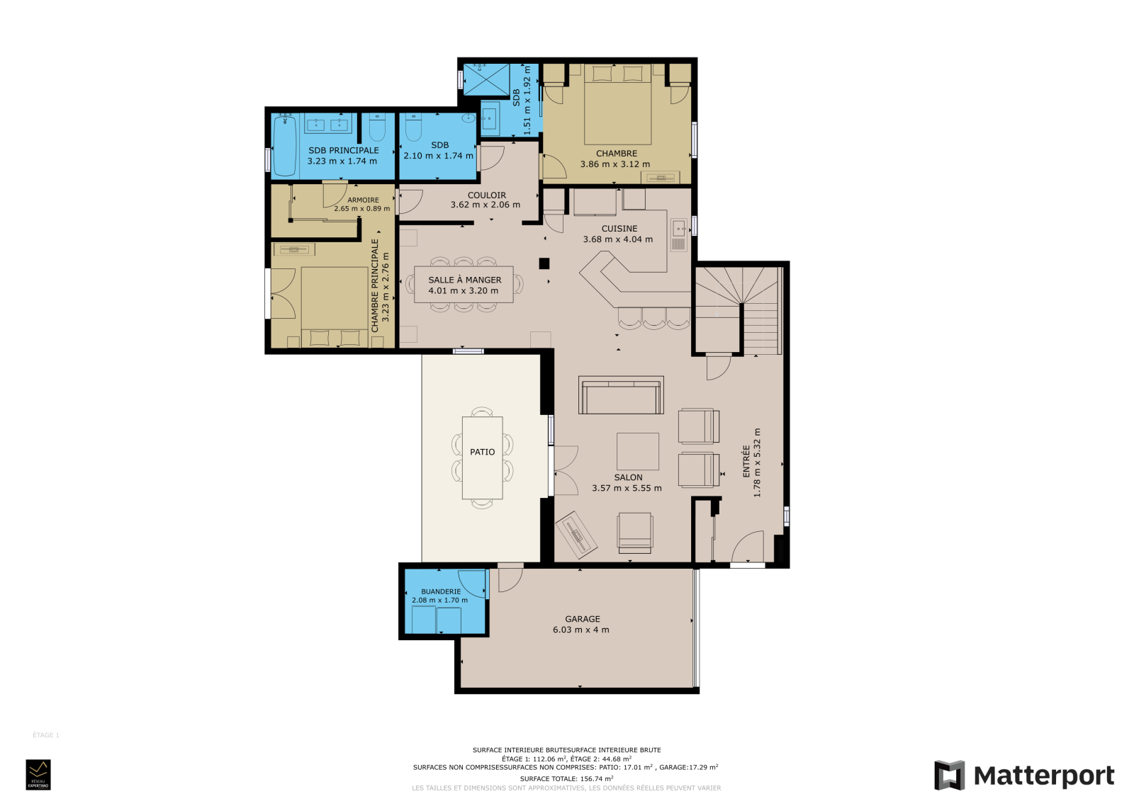 Accès vers entrée, salle à manger, terrasse, débarras, Escaliers