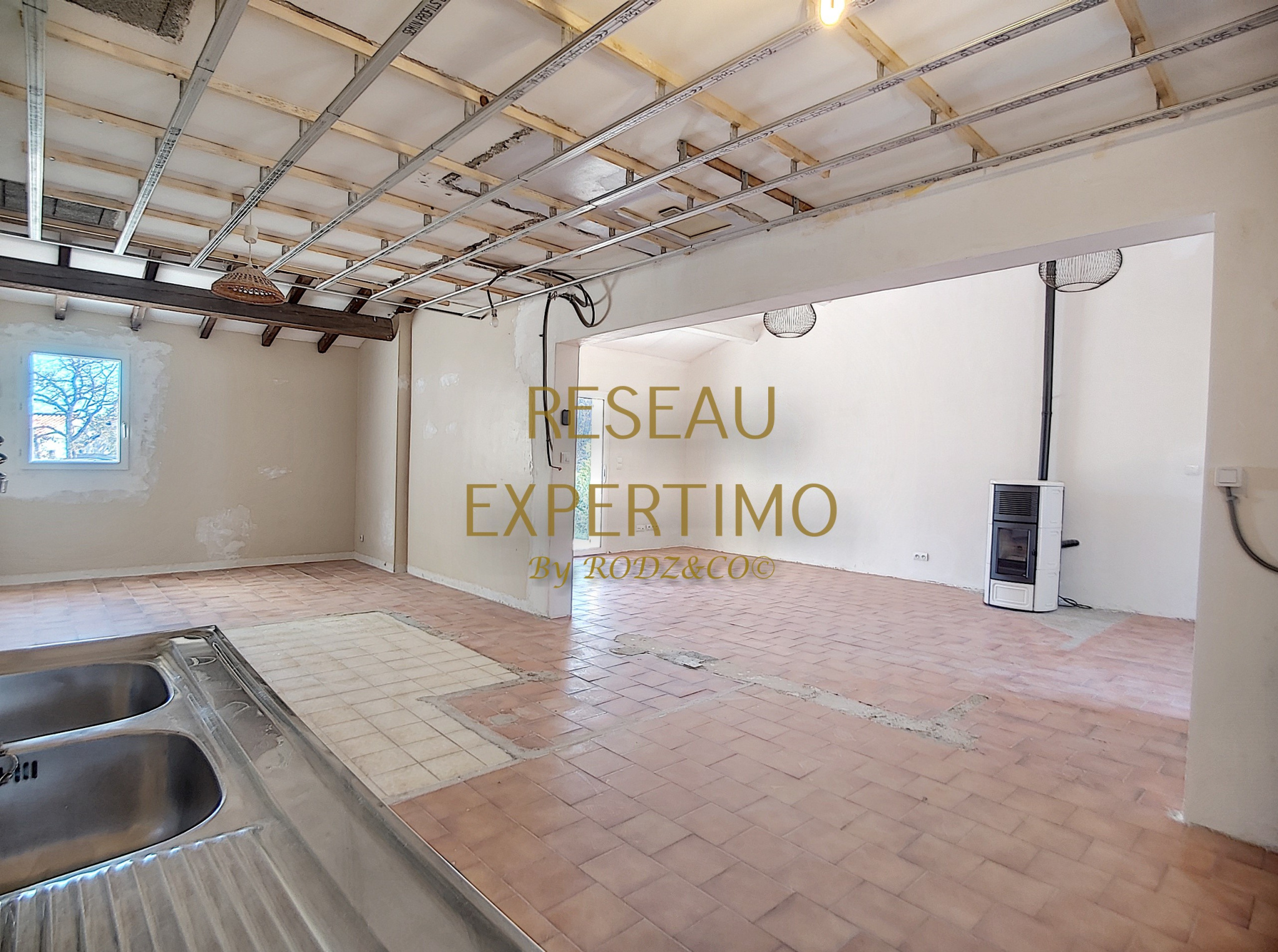 L'intérieur de la maison offre de grands volumes, à savoir une vaste pièce de vie haute de plafond à terminer d'aménager dans la partie la plus ancienne du logement (Placoplâtres + peintures + ragréage sols partie cuisine, cuisine à aménager/équiper, pose et jointage carrelage).