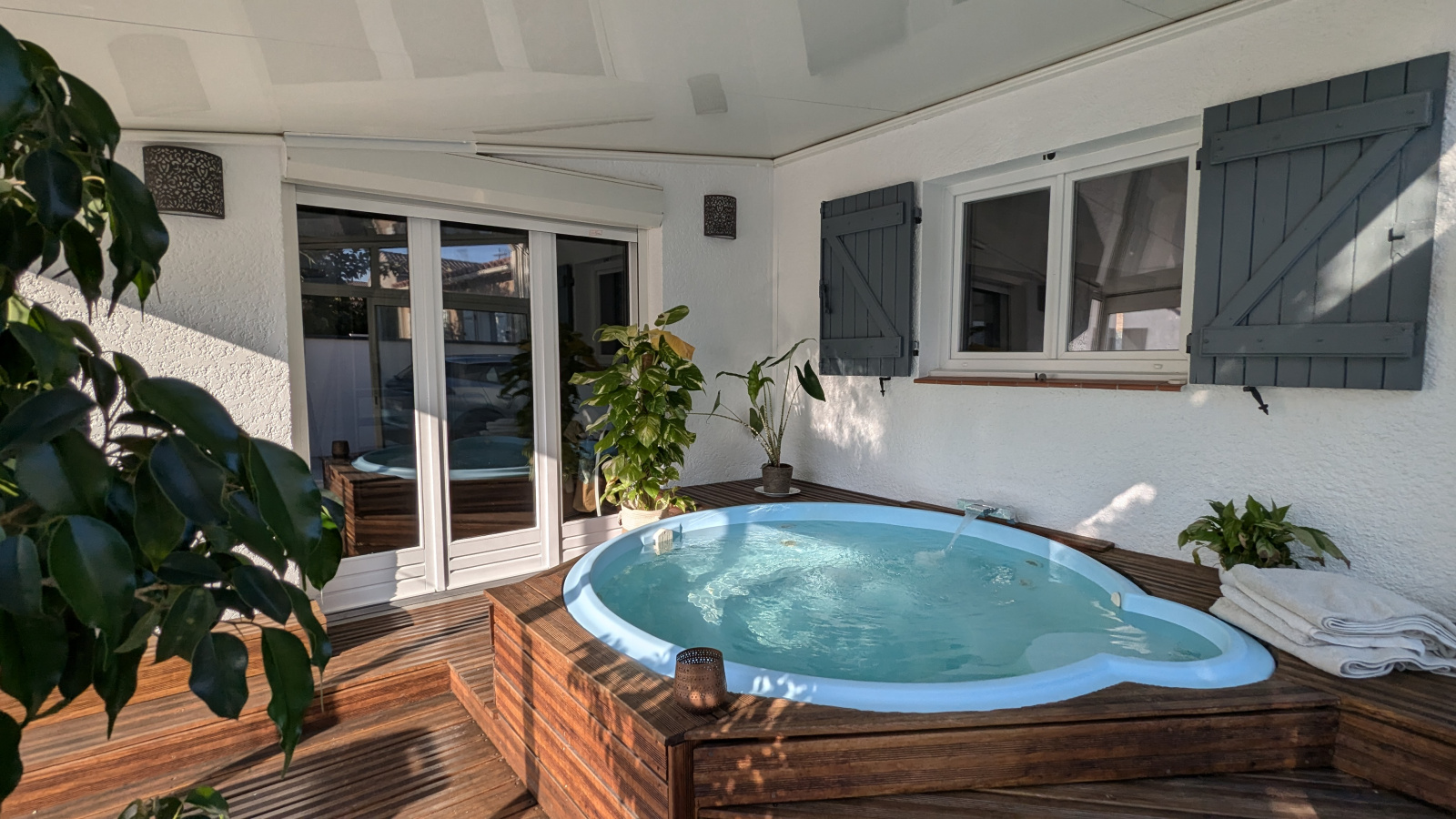 D'une grande pièce de vie chaleureuse avec un salon équipé d'une cheminée, d'un espace salle à manger convivial, d'une cuisine entièrement équipée, d'une chambre spacieuse, d'un espace dressing qui mène à une véranda avec jaccuzi pour des moments de détente, d'une salle d'eau moderne avec une douche à l'italienne ainsi que d'un WC séparé.Â