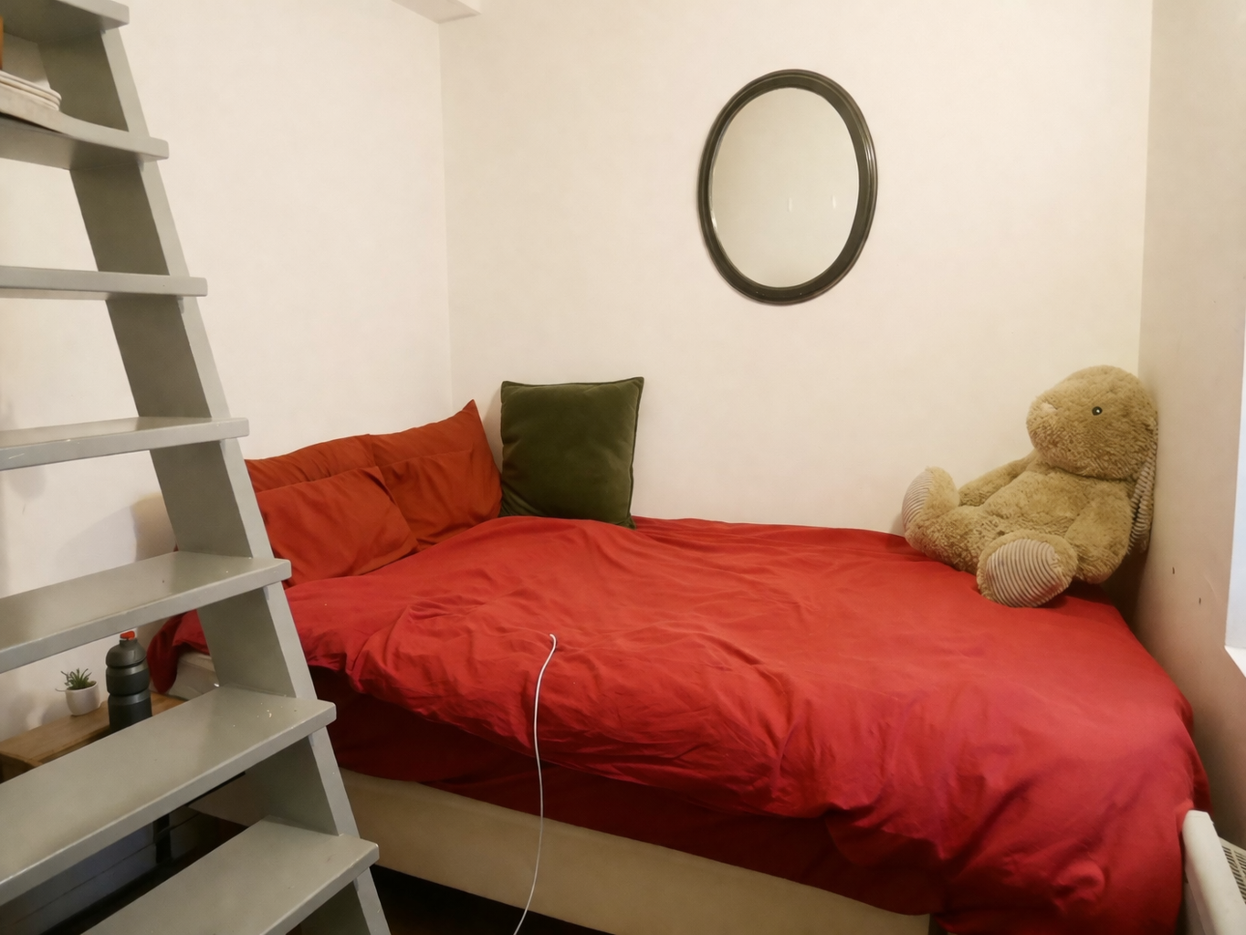 Suivent une salle de bain avec toilette, un espace bureau qui peut être utilisé en petite chambre comme actuellement, une mezzanine de 4 m² au sol.