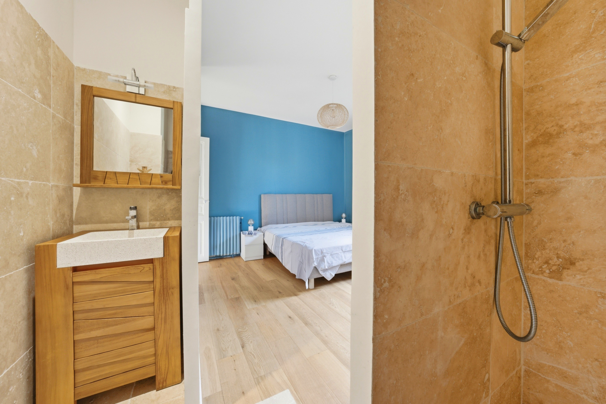 Au premier niveau, vous découvrirez un spacieux salon avec vue dégagée donnant accès à une terrasse de 100 m², une cuisine séparée, ainsi que trois belles chambres, chacune disposant de sa salle d’eau. Un WC indépendant complète cet étage.