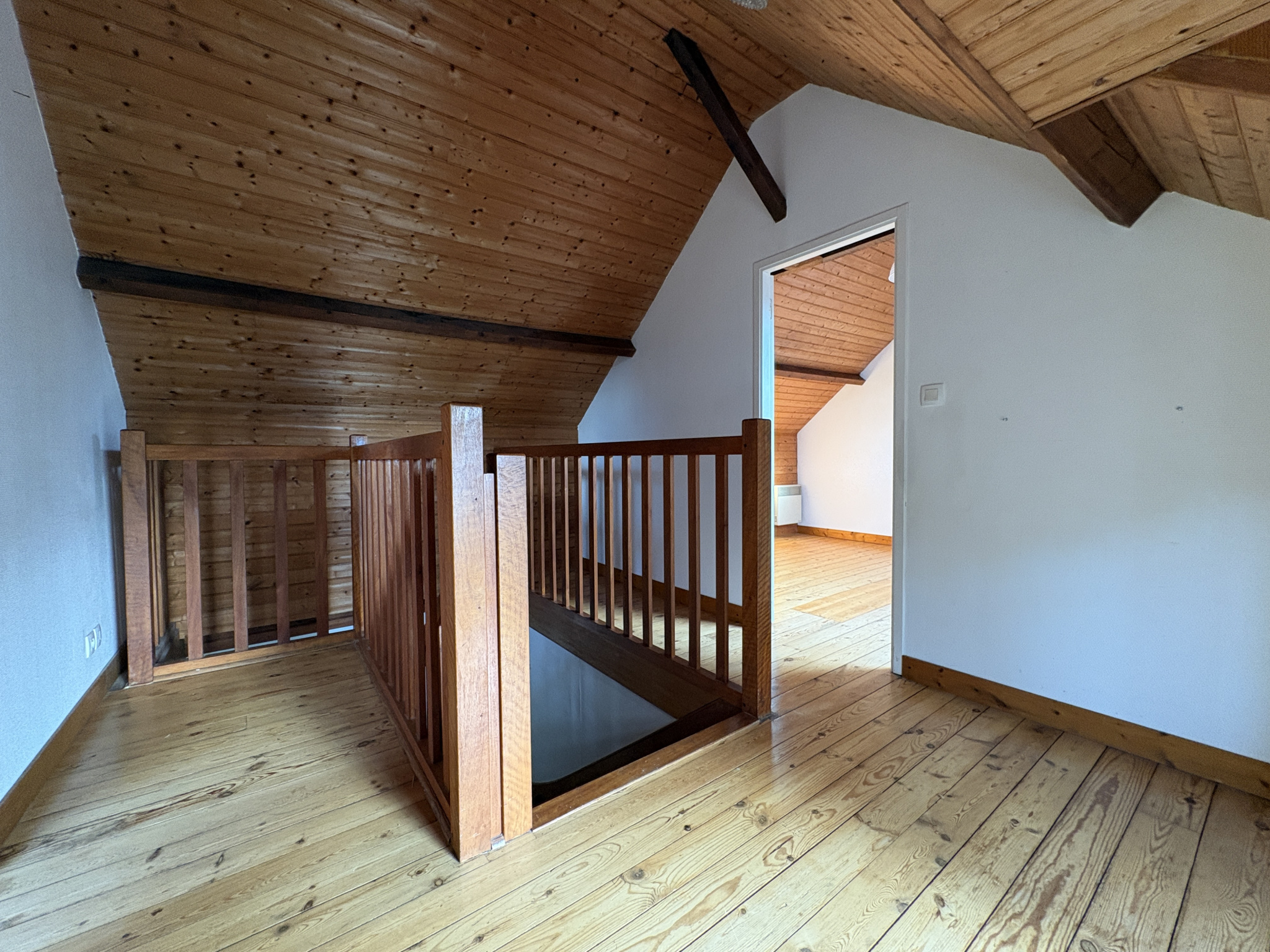 À l’étage, le palier distribue deux chambres sur parquet massif, pleines de charme et de lumière, ainsi qu’un grenier aménageable offrant un beau potentiel supplémentaire.