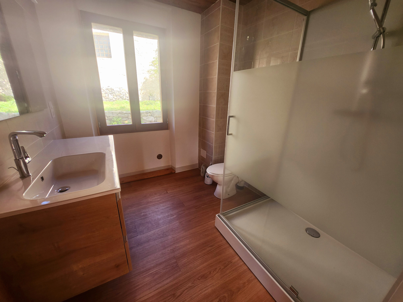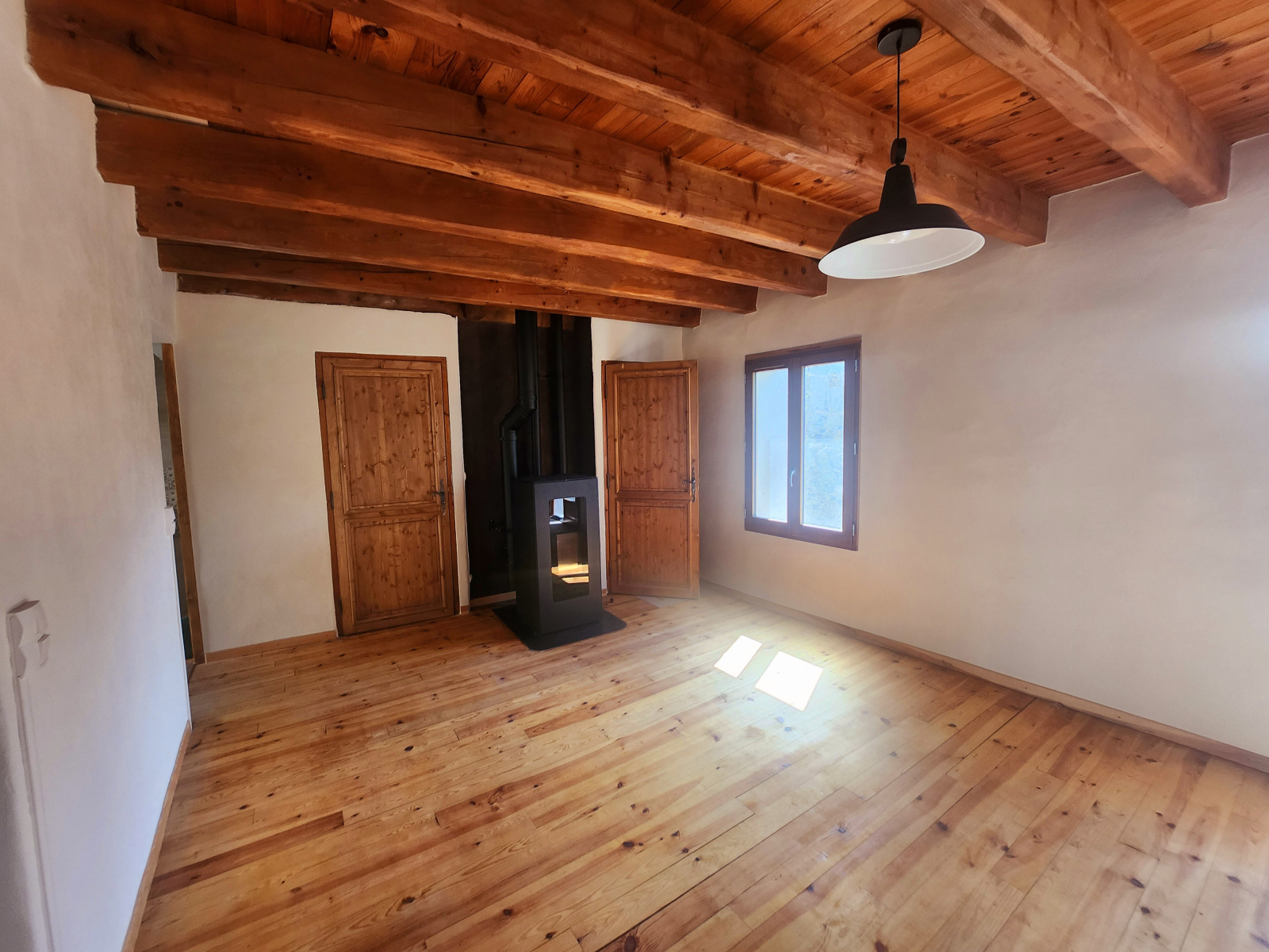 d'un agréable séjour équipé d'un poele à granules de dernière génération ainsi qu'une cuisine donnant sur la terrasse, un chambre et une salle d'eau au 1er étage.
