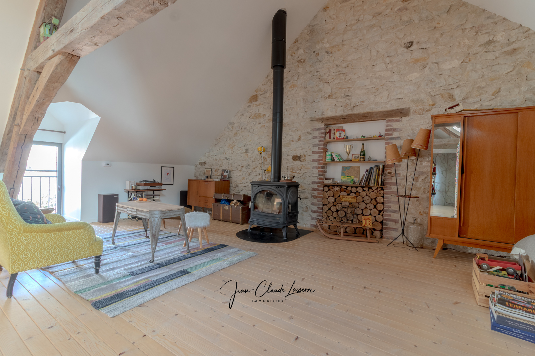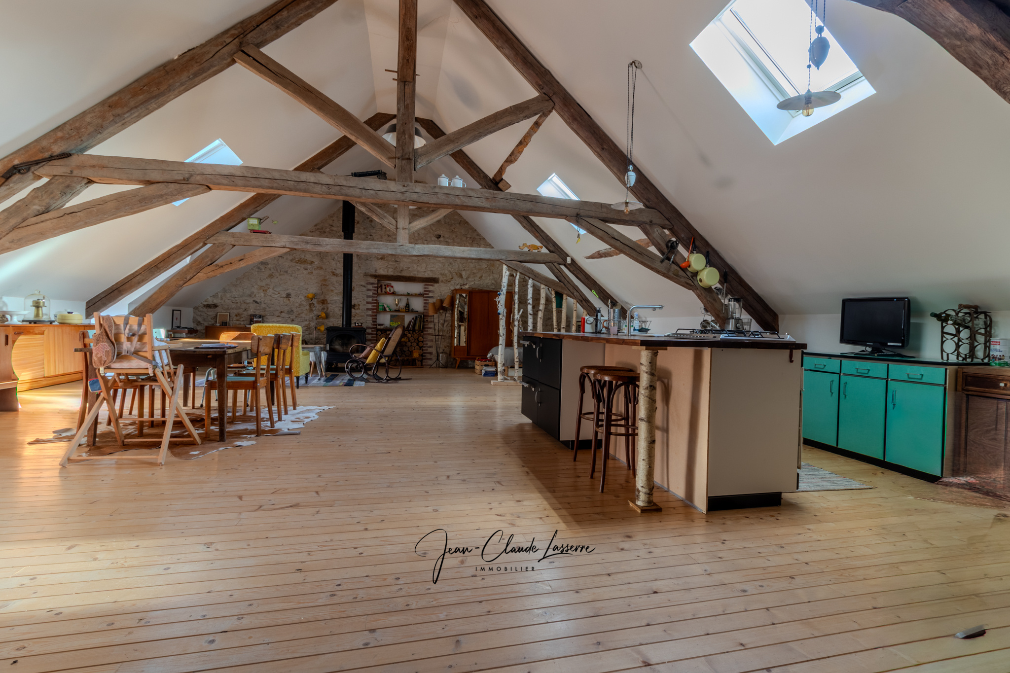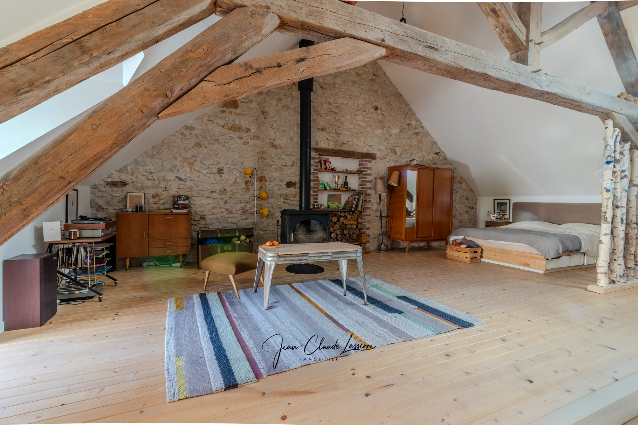 À l’étage, un loft de 90 m² propose une atmosphère chaleureuse. Il se compose d’un espace de vie avec coin nuit, cuisine et salle de bains. Un poêle à bois renforce le caractère et le confort du lieu.