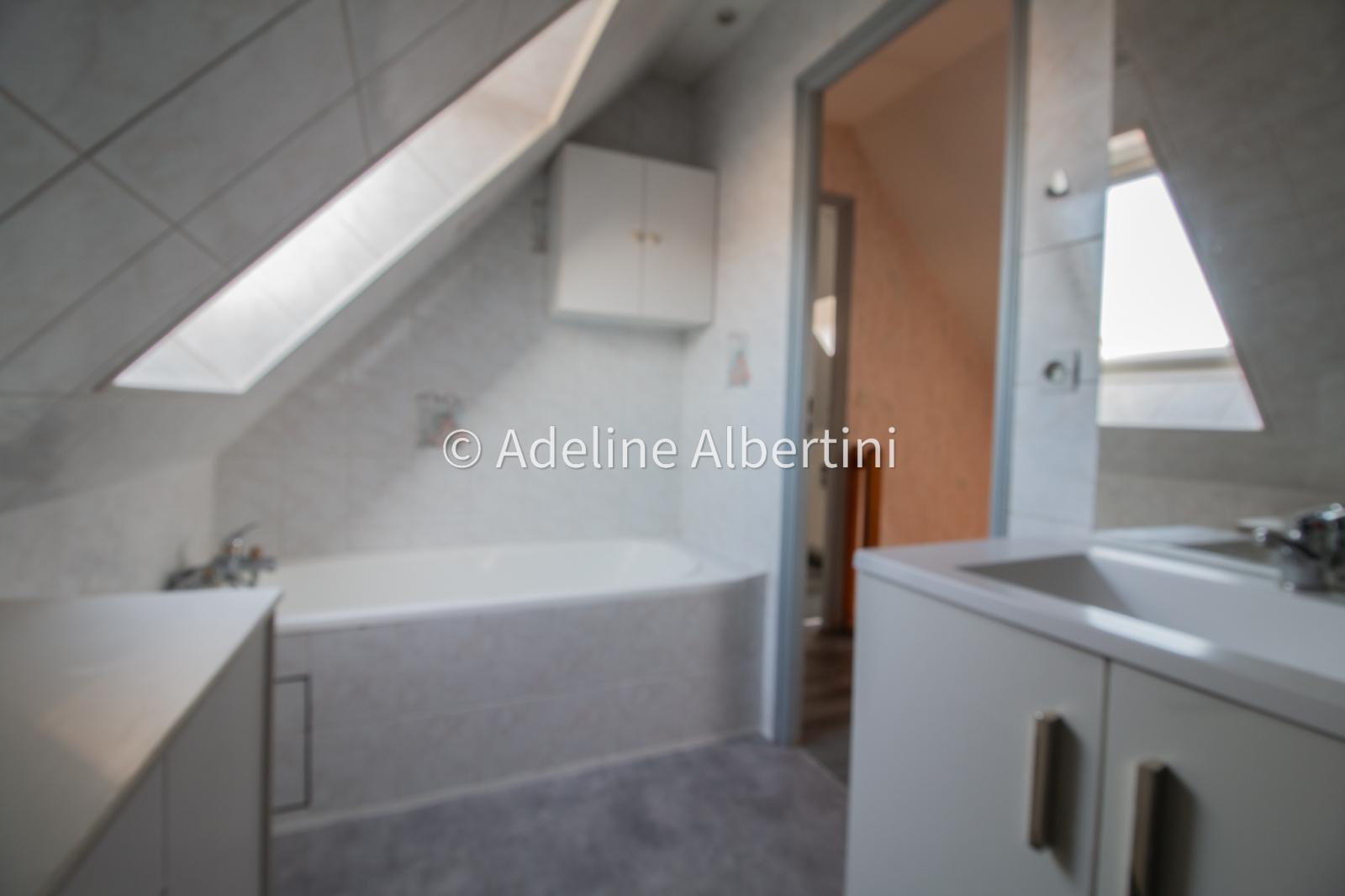 A l'étage côté gauche de l'immeuble se trouve un appartement trois pièces composé d'un séjour avec cuisine ouverte , un wc et au second étage deux chambres avec une salle d'e bain avec baignoire et douche et un second wc.