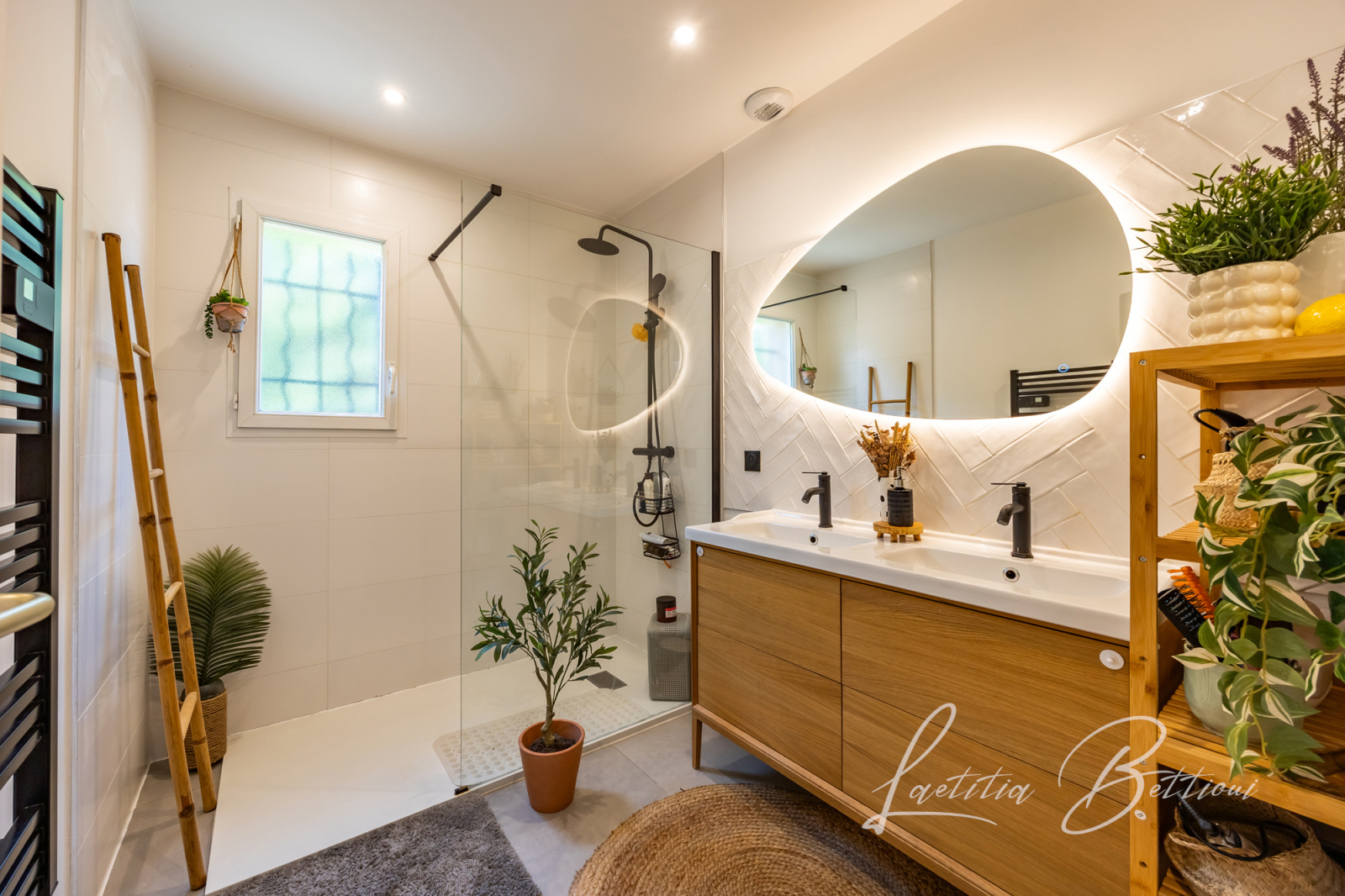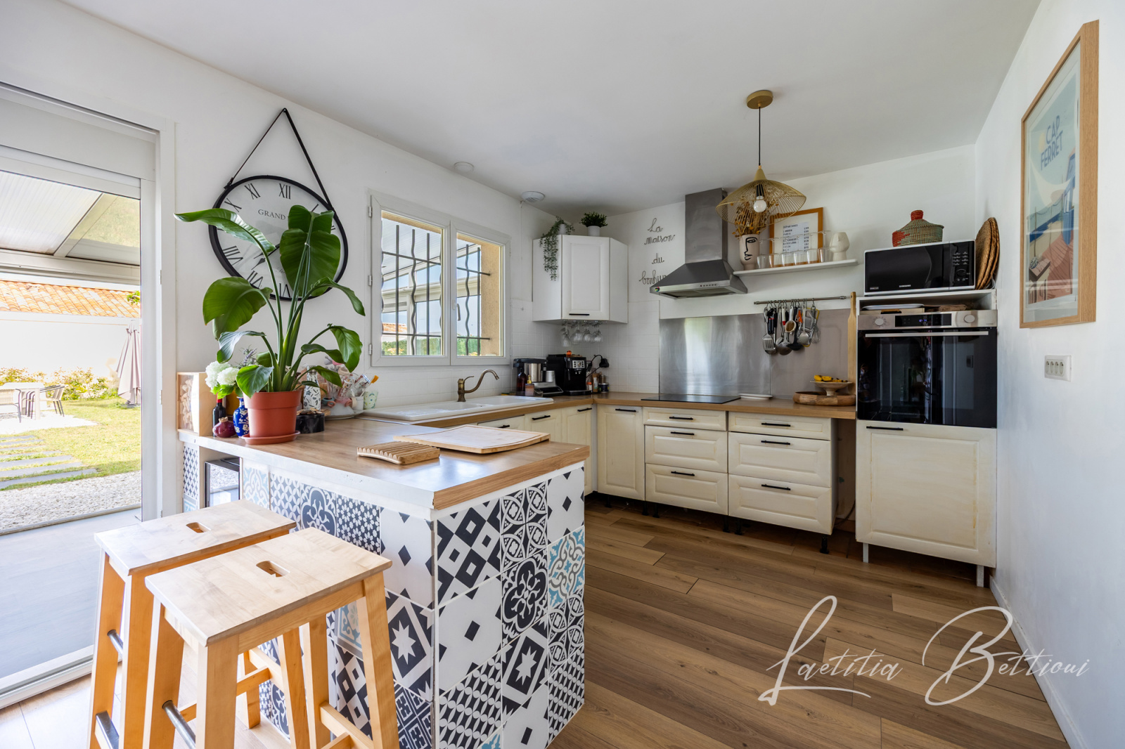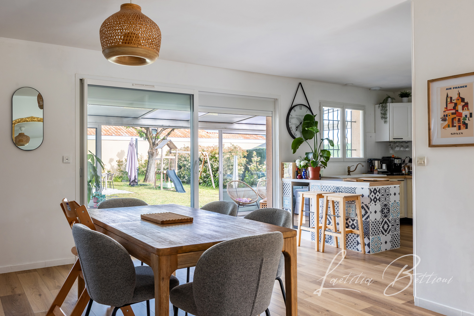 Les espaces s’organisent ensuite naturellement autour d’une pièce de vie de 50 m², ouverte et lumineuse, avec une cuisine conviviale et un accès direct vers l’extérieur.