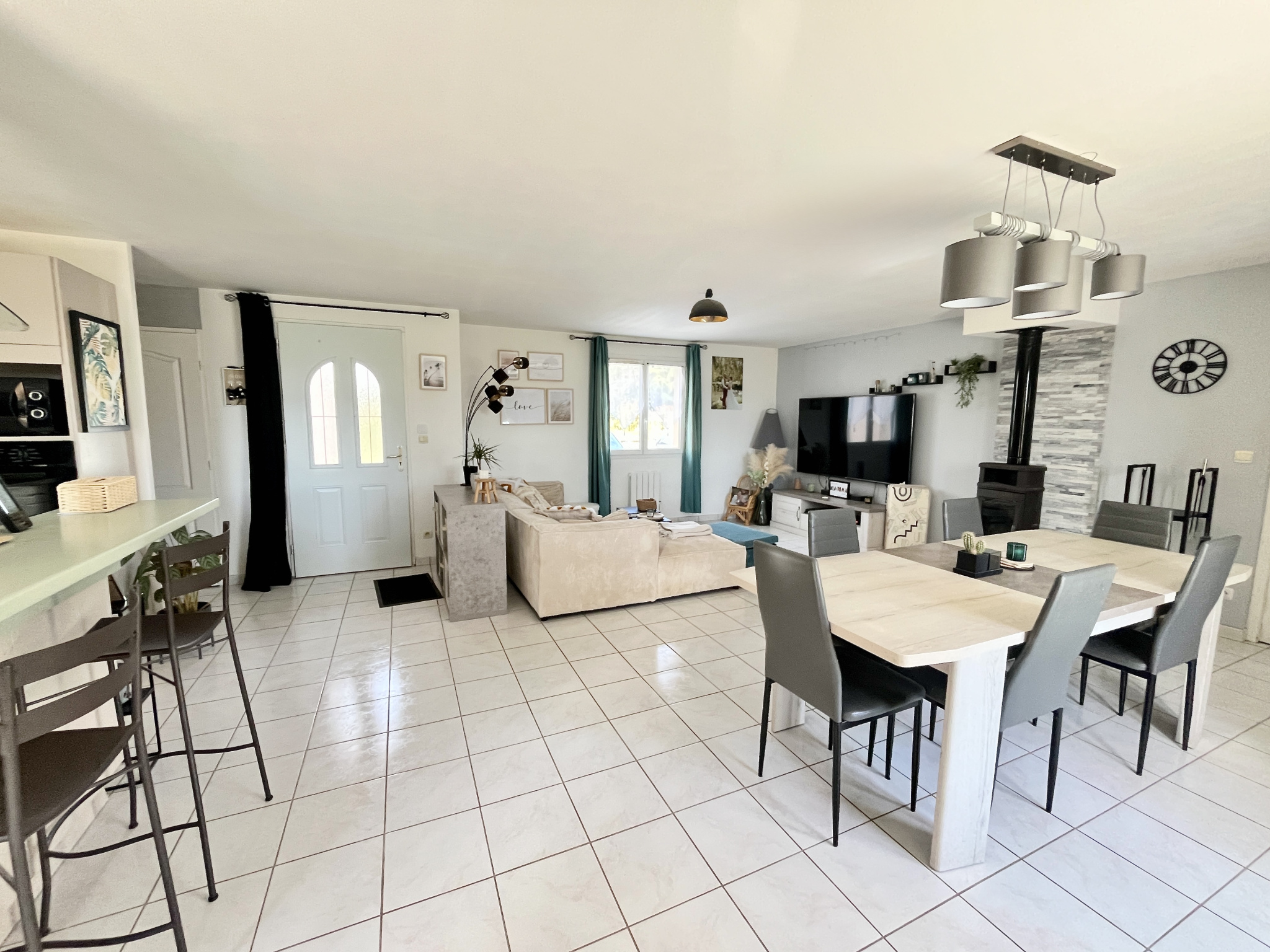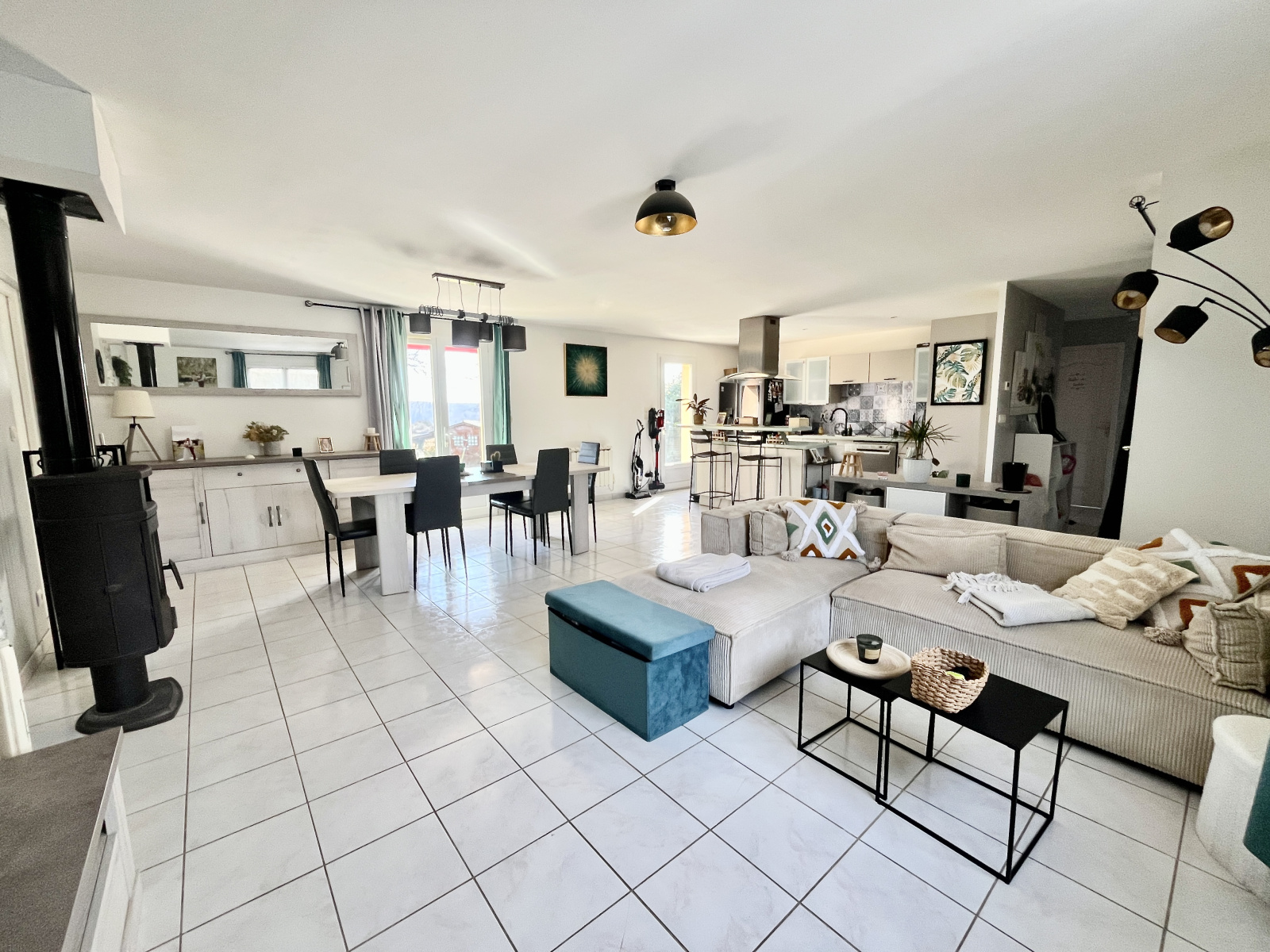 La grande pièce à vivre ouverte sur une cuisine aménagée, offre un espace total de 48 m² agrémenté d'un poêle à bois et d'une terrasse bénéficiant d'une vue dégagée très agréable.