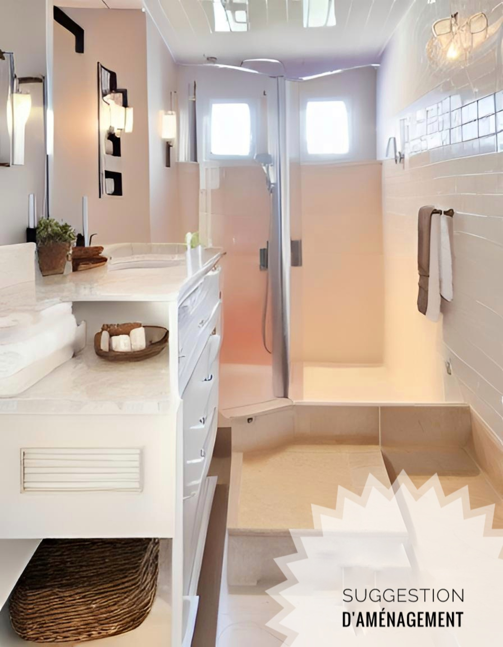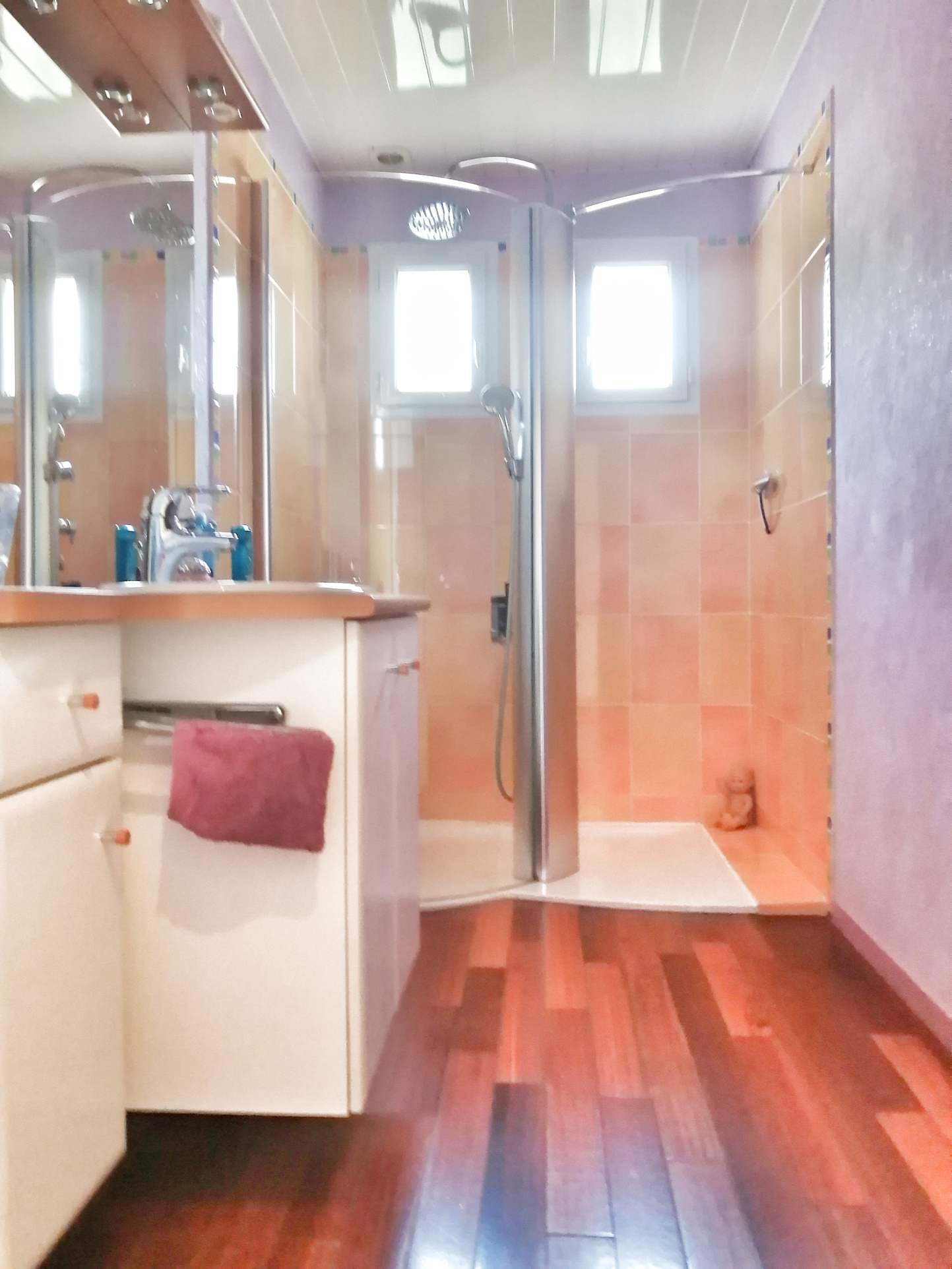 - 1 salle de bain, parquet bois bateau, avec grande douche à l'italienne