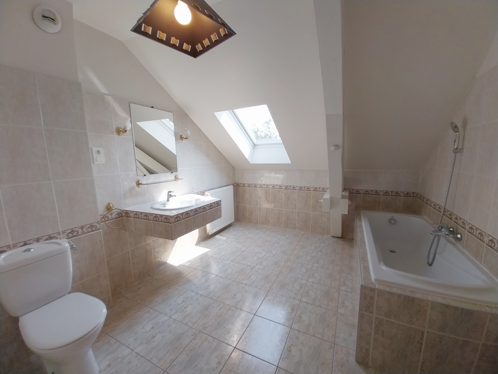 A l'étage : dégagement, deux chambres (12m², parquet, exposée Est - 12m², parquet, exposée Ouest), salle de bains avec WC.