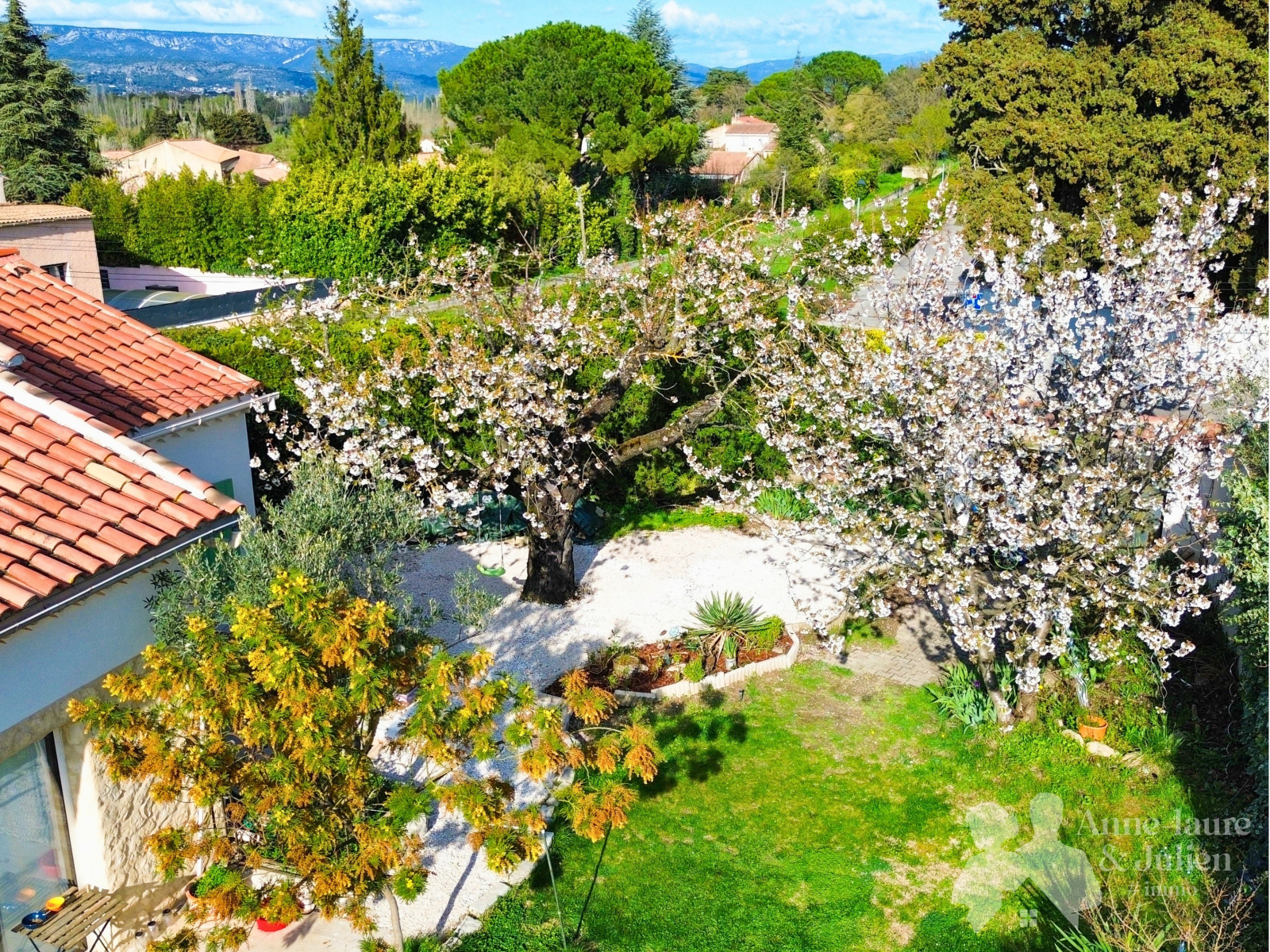 A l'extèrieur vous pourrez profiter du jardin joliment arboré : cerisiers, mimosas... Une agréable terrasse pour profiter de moments de partage en famille ou entre amis.