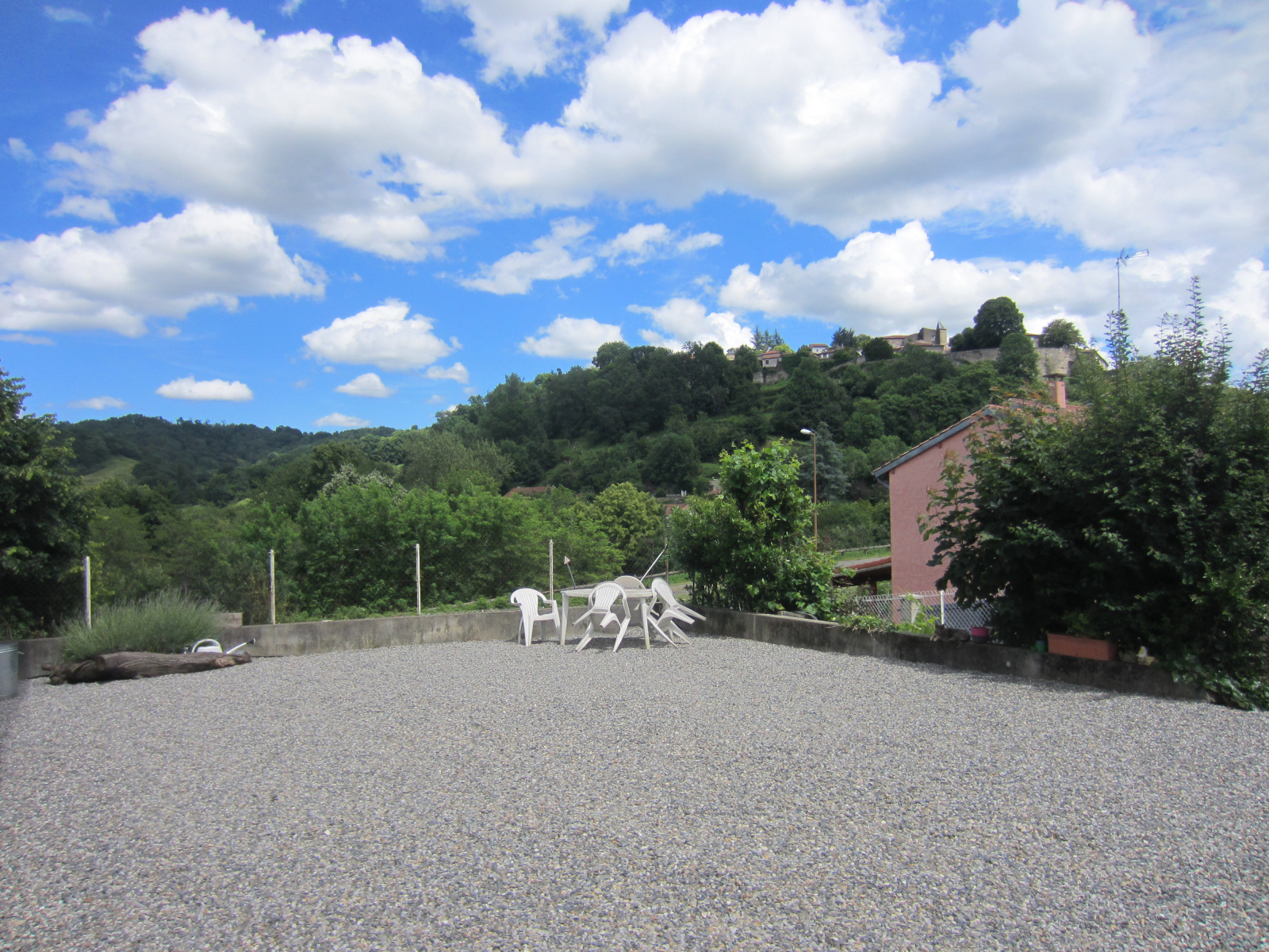 Le terrain se divise en deux parties: devant la maison, on a un petit espace fleuri et une grande cour-parking, à l'arrière on a un grand terrain de 800 m², à aménager selon vos goûts, tout est possible: potager, piscine, verger, espace pour animaux de compagnie...avec en prime une vue superbe sur Saint-Lizier.
