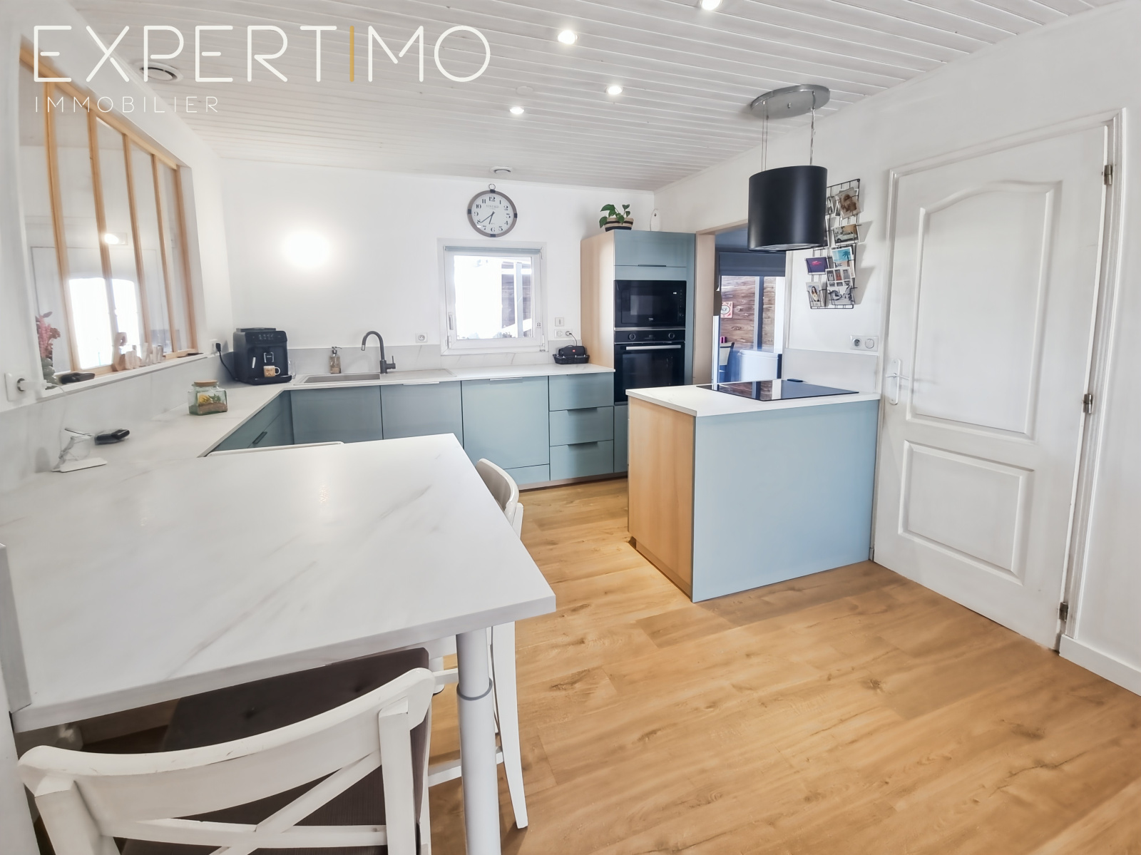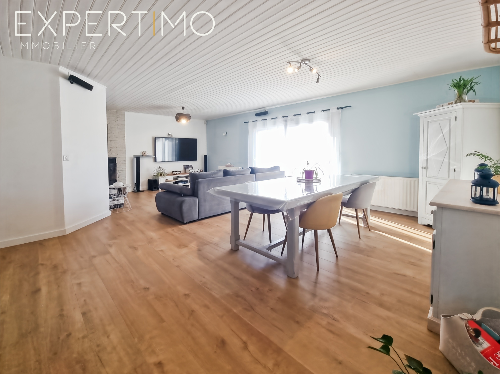 - Grande pièce de vie lumineuse avec cuisine ouverte équipée et aménagée, donnant sur un spacieux salon-séjour avec poêle à bois pour une ambiance chaleureuse