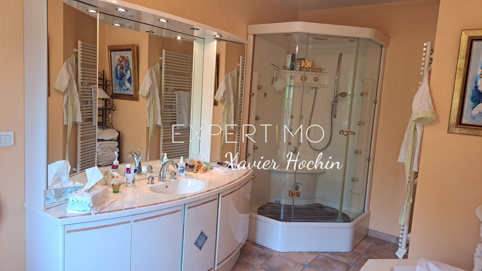 D'une surface généreuse de 277m², elle offre , de plain pied, un spacieux séjour d'environ 100m² et une cheminée centrale, une cuisine séparée toute équipée avec plans de travail en granit, une réserve attenante, ainsi que 2 chambres avec salle d'eau, dont l'une avec en plus une baignoire balnéo. Toutes les pièces de ce plain pied donnent un accés direct à une grande et charmante terrasse, un joli jardin arboré et un bassin, le tout sans vis à vis.