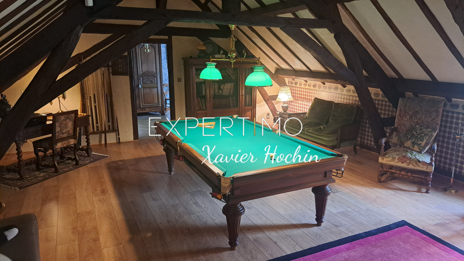 A l'étage, sous mansardes, une belle salle de billard et salon de lecture dessert 2 chambres supplémentaires avec chacune une salle d'eau, ainsi qu'un grenier.