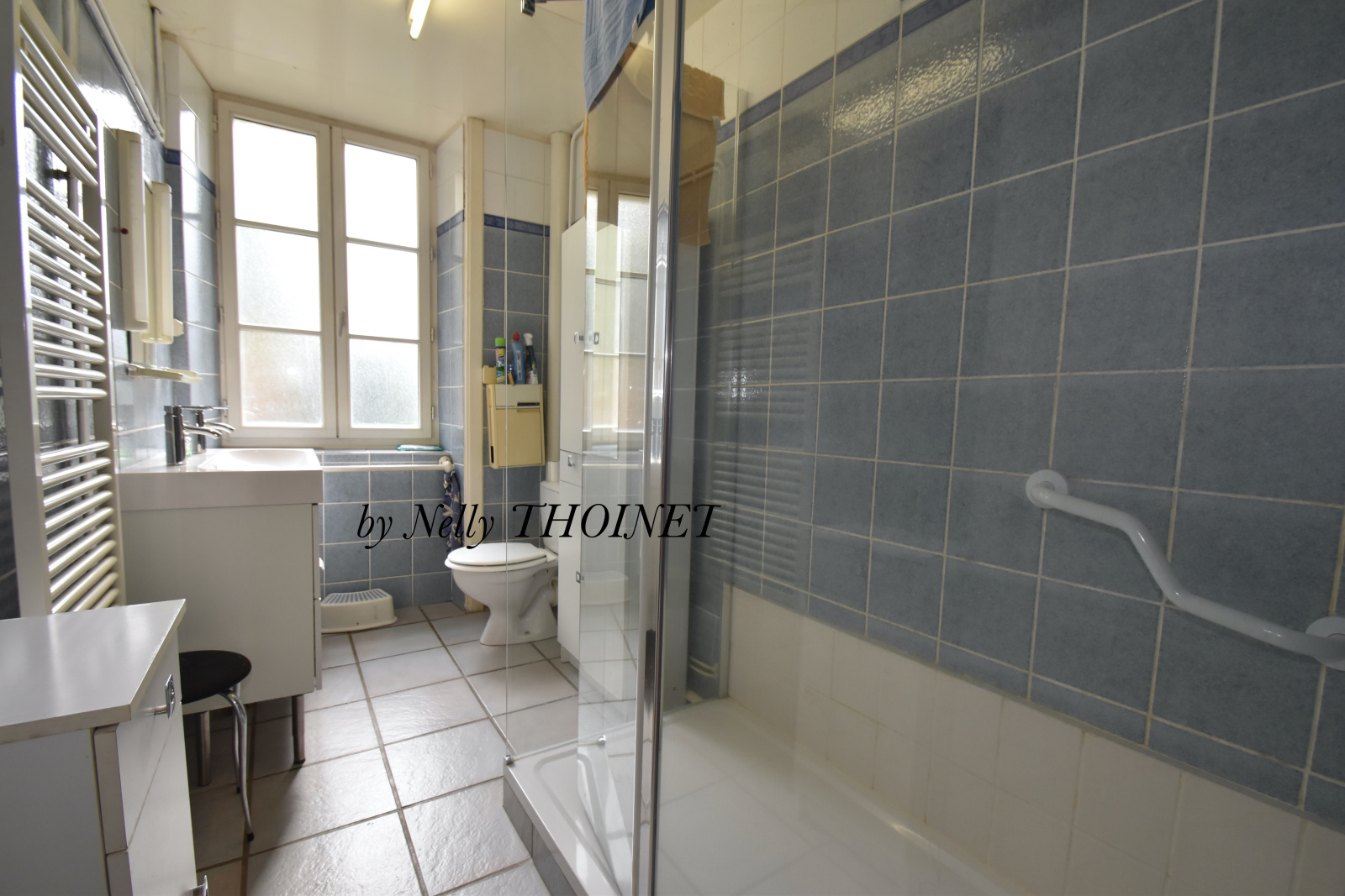 cabine de douches, vasque, sèche serviette