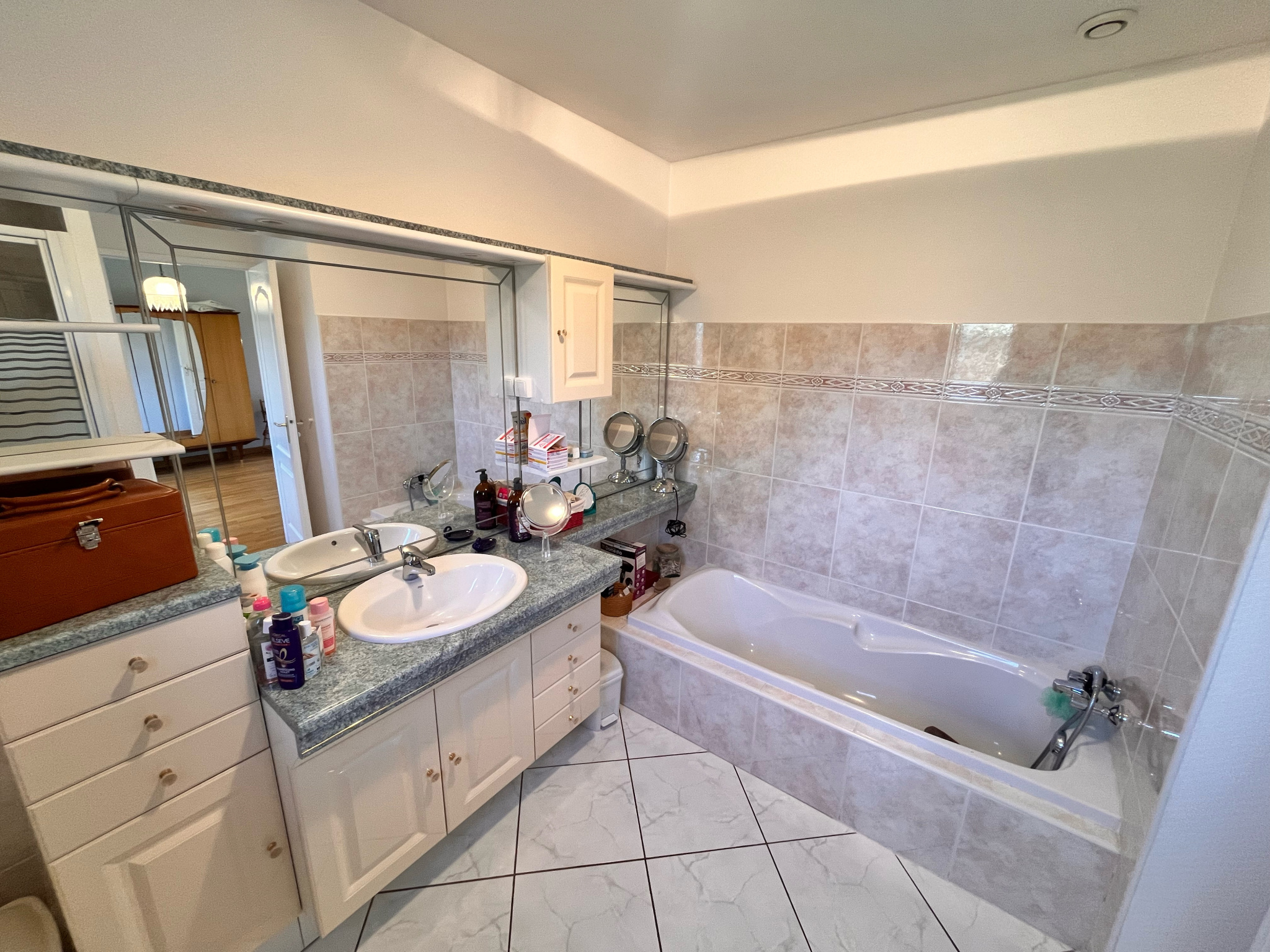 Côté nuit : Le couloir dessert deux grandes chambres de 13 m² et 15 m², une salle de bains et des WC séparés.