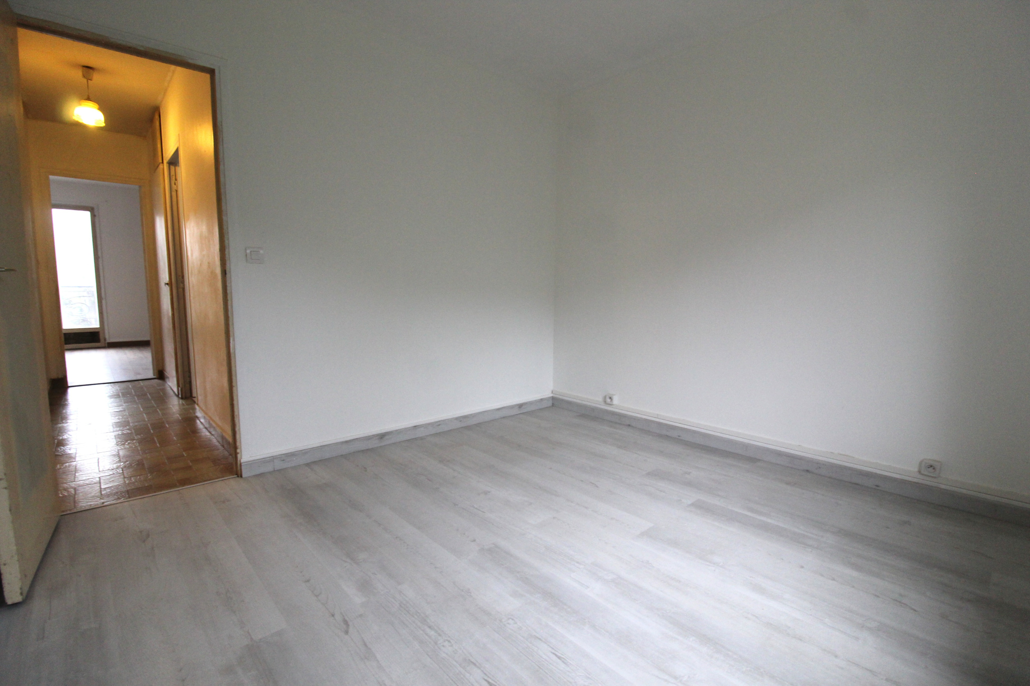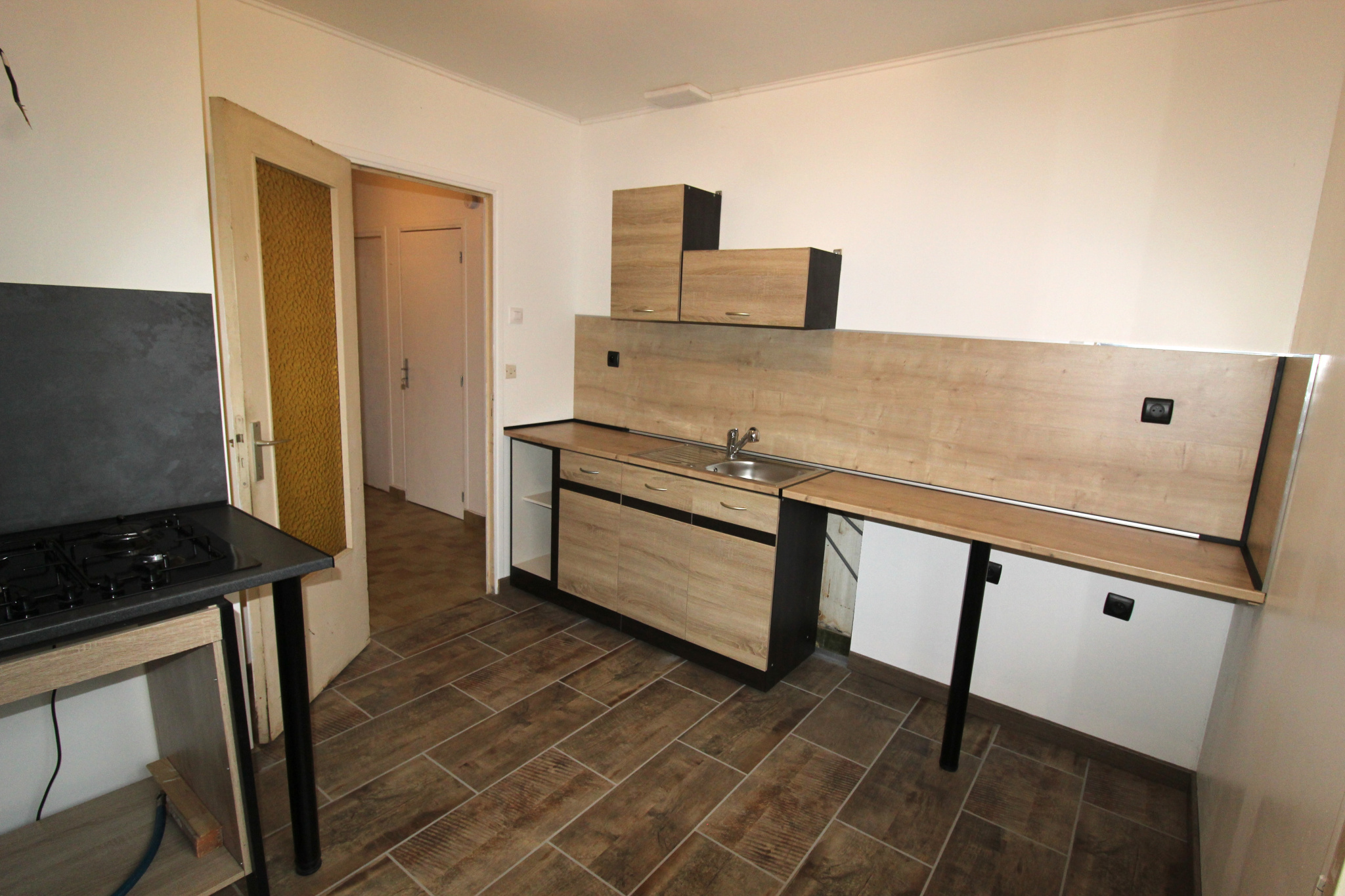 Une entrée donnant accès à une pièce de vie avec sa cuisine,